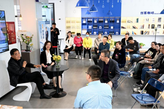 “青春聆听”话奋斗,青年创客代表们与宁夏著名作家季栋梁面对面交流。季栋梁分享长篇报告文学《西海固笔记》(荣获“2022中国好书”、第十八届文津图书奖)创作经历,与会人员和作家就“青春”“奋斗”等话题进行交流讨论。