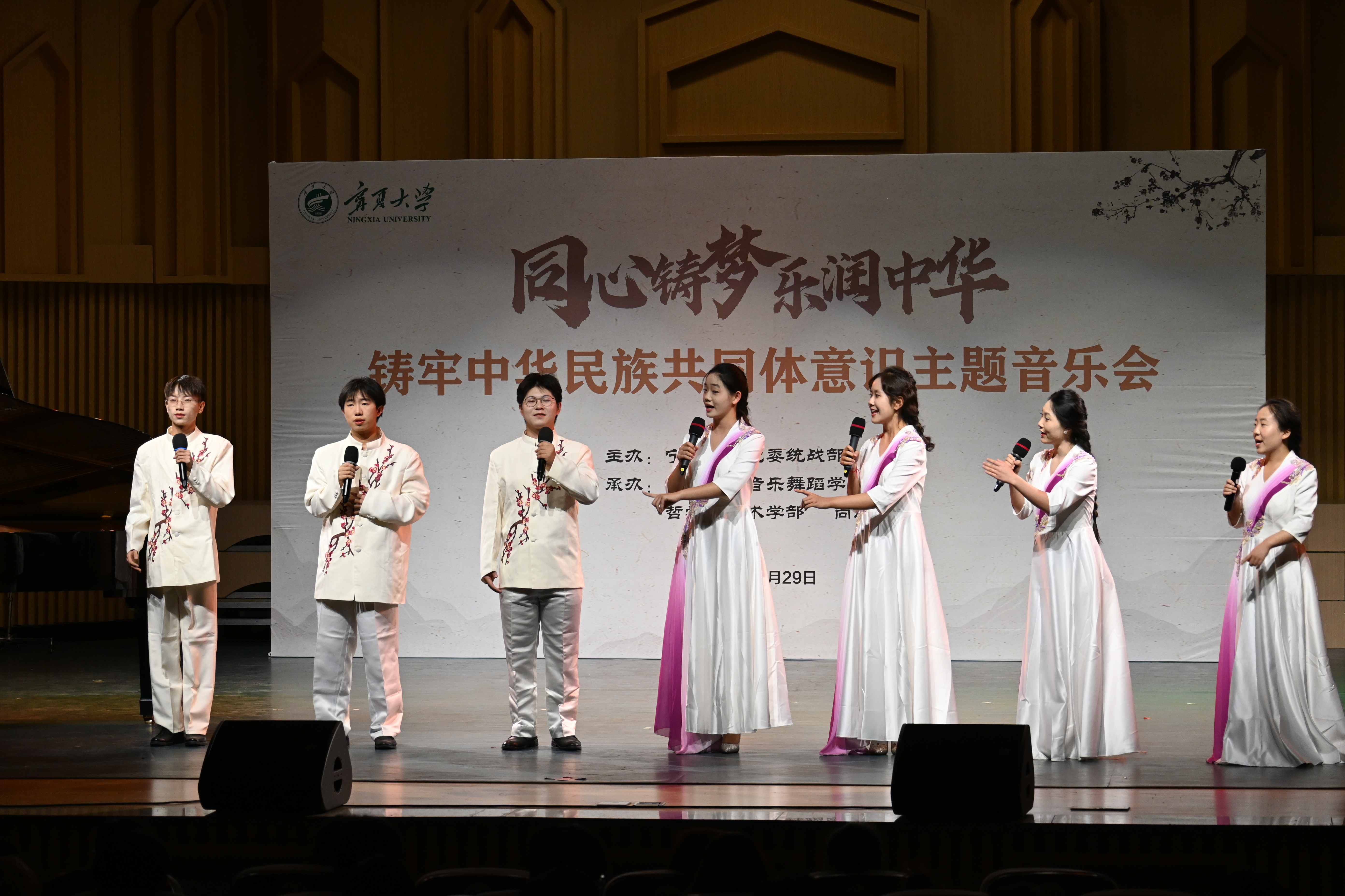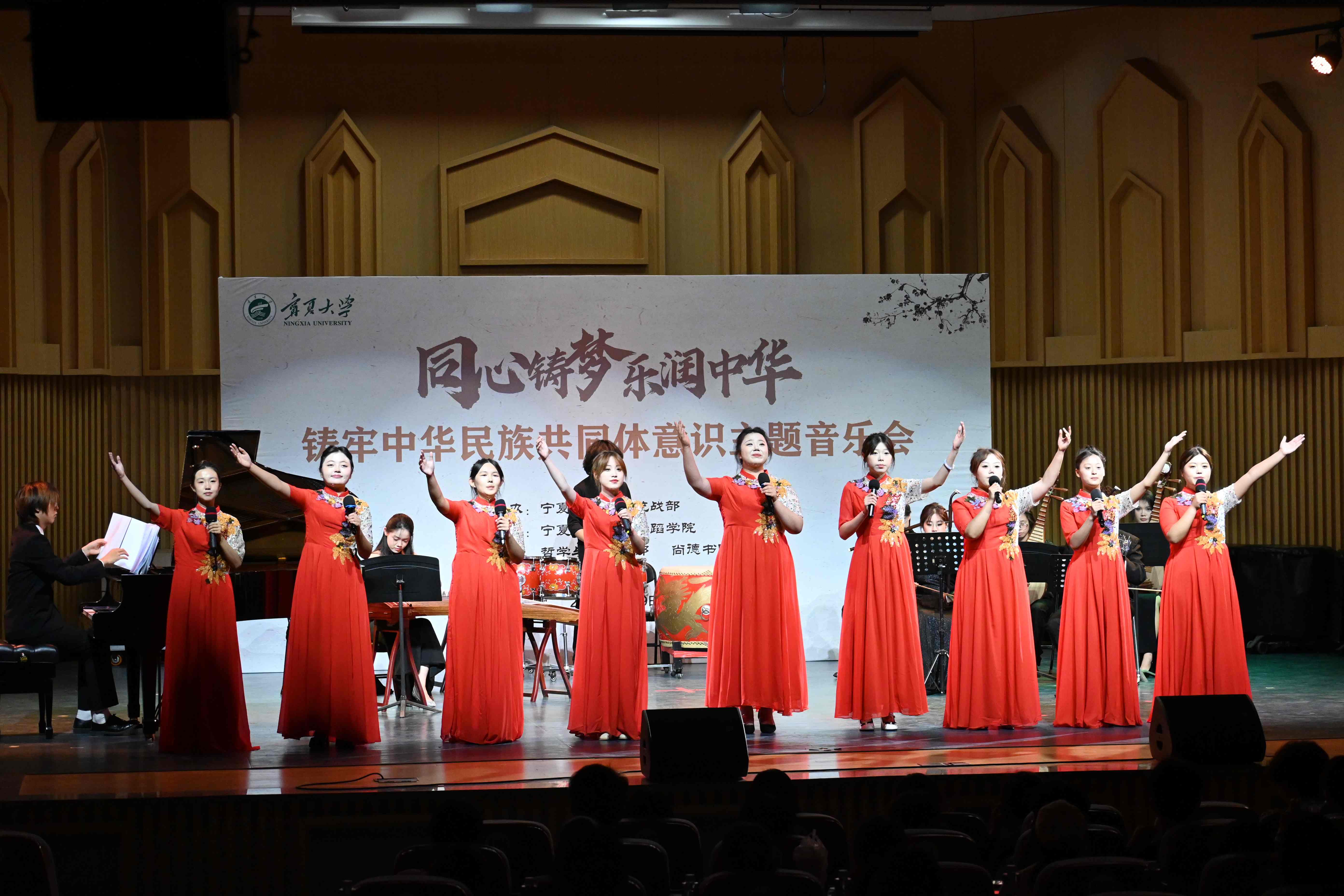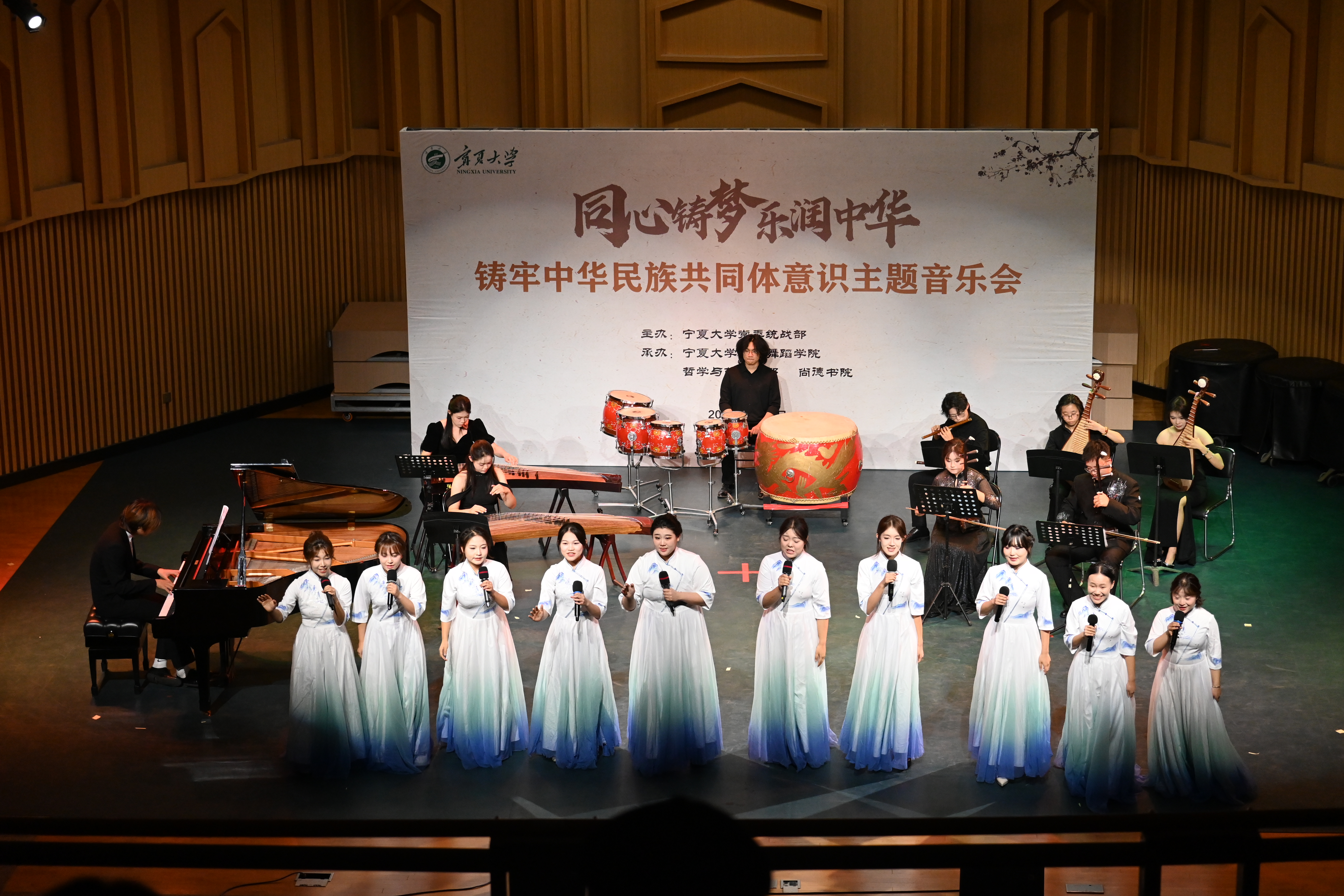 音乐会在一曲洋溢着民族团结氛围的民族器乐合奏中拉开序幕。上半场以“华夏国风,丝竹和鸣”为主题,集中呈现了我国各民族丰富多彩的音乐文化。从西南地区的《太阳出来喜洋洋》到江南水乡的《茉莉花》,从湘西民歌《马桑树儿搭灯台》到山西民歌《走西口》,同学们以真挚的情感与精湛的表演,生动诠释了“五个共同”的深刻内涵。下半场“梨园精粹,塞上高歌”将现场气氛推向高潮。戏曲联唱《苏三起解》《刘海砍樵》展现了中华戏曲的独特韵味,而宁夏本土“花儿”《妹妹的山丹花开》《眼泪花花把心淹了》等节目,则以高亢悠扬的唱腔、质朴深情的演绎,生动呈现了“休戚与共、荣辱与共、生死与共、命运与共”的中华民族共同体理念。这些由多民族共同传承的非物质文化遗产,成为各民族交往交流交融的鲜活见证。