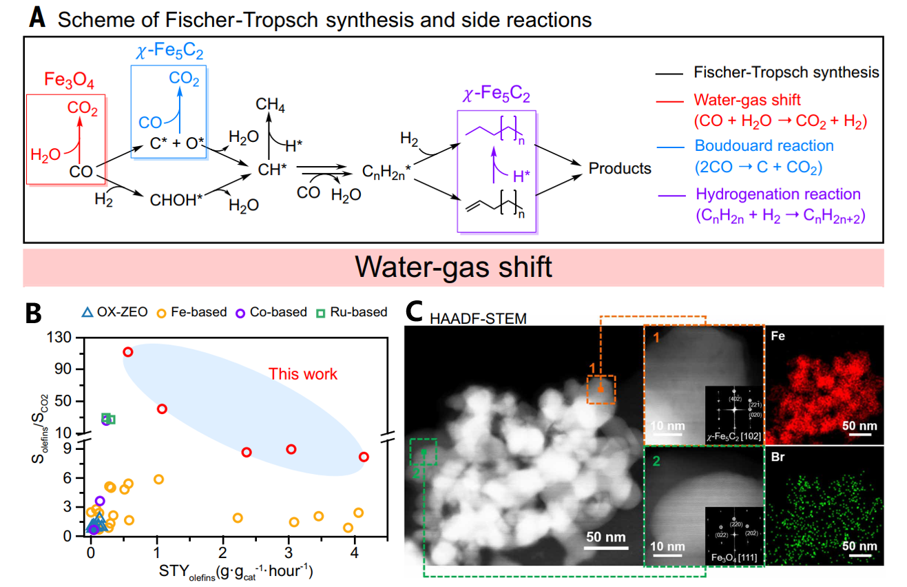 该研究开发出一项操作简便但效果显著的催化调控策略,在合成气中引入百万分之一(ppm)浓度的溴甲烷(CH3Br),系统追踪了FeCx催化剂活性相在费托工况条件下的原子级结构重构轨迹,实现了对费托铁基催化剂表面反应路径的精准控制。实验结果显示,ppm级别的溴甲烷就可以将生成CO2的反应路径关闭,CO2的生成选择性从传统的30%左右降低至不足1%,几乎实现“零排放”;同时,目标产物——烯烃的选择性显著提高至85%左右,烯烃/烷烃比值更是达到约13。这一策略不仅解决了长期困扰铁基FTS的高CO2副产率问题,也打破了高烯烃时空产率与低碳排放之间难以兼得的技术壁垒,为绿色合成气转化和低碳化工制造提供了新范式。