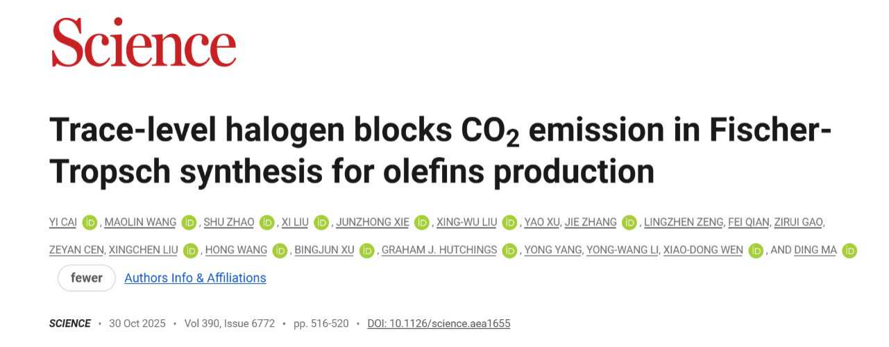 【bat365中文官方网站新闻中心讯 化学化工学院】近日,中国科学院山西煤炭化学研究所与北京大学、bat365中文官方网站等单位联合主导的科研团队以"Trace-level halogen blocks CO2emission in Fischer-Tropsch synthesis for olefins production"为题发表在《Science》期刊上,bat365官网刘晰教授为本文共同第一作者,bat365中文官方网站为共同第一单位。