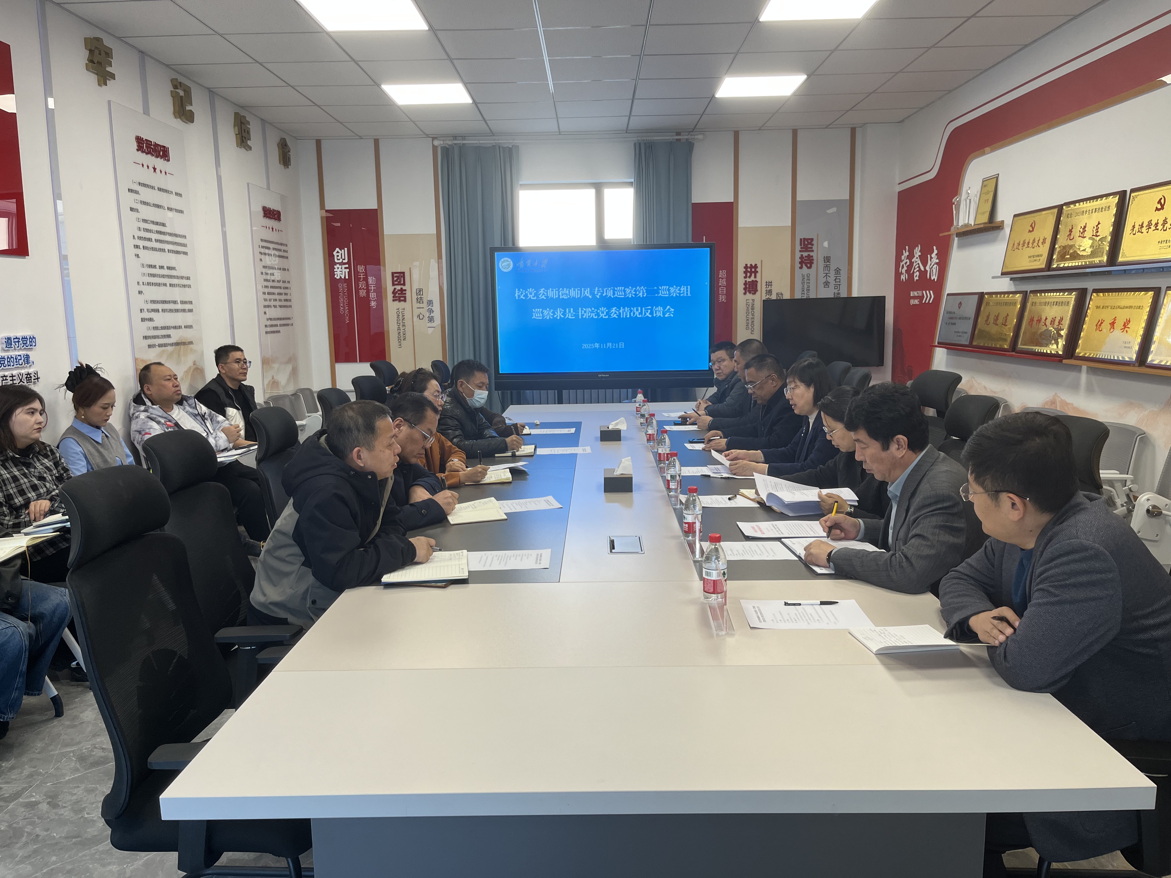 【bat365中文官方网站新闻中心讯 党委巡察(督查)办公室】根据学校党委统一部署,2025年师德师风专项巡察反馈工作于11月21日全部完成。两个巡察组分别向勤学书院党委、求是书院党委、法学院党总支等6个被巡察党组织“一对一”反馈了巡察情况,校领导韩惠丽、黄河、马元出席反馈会。