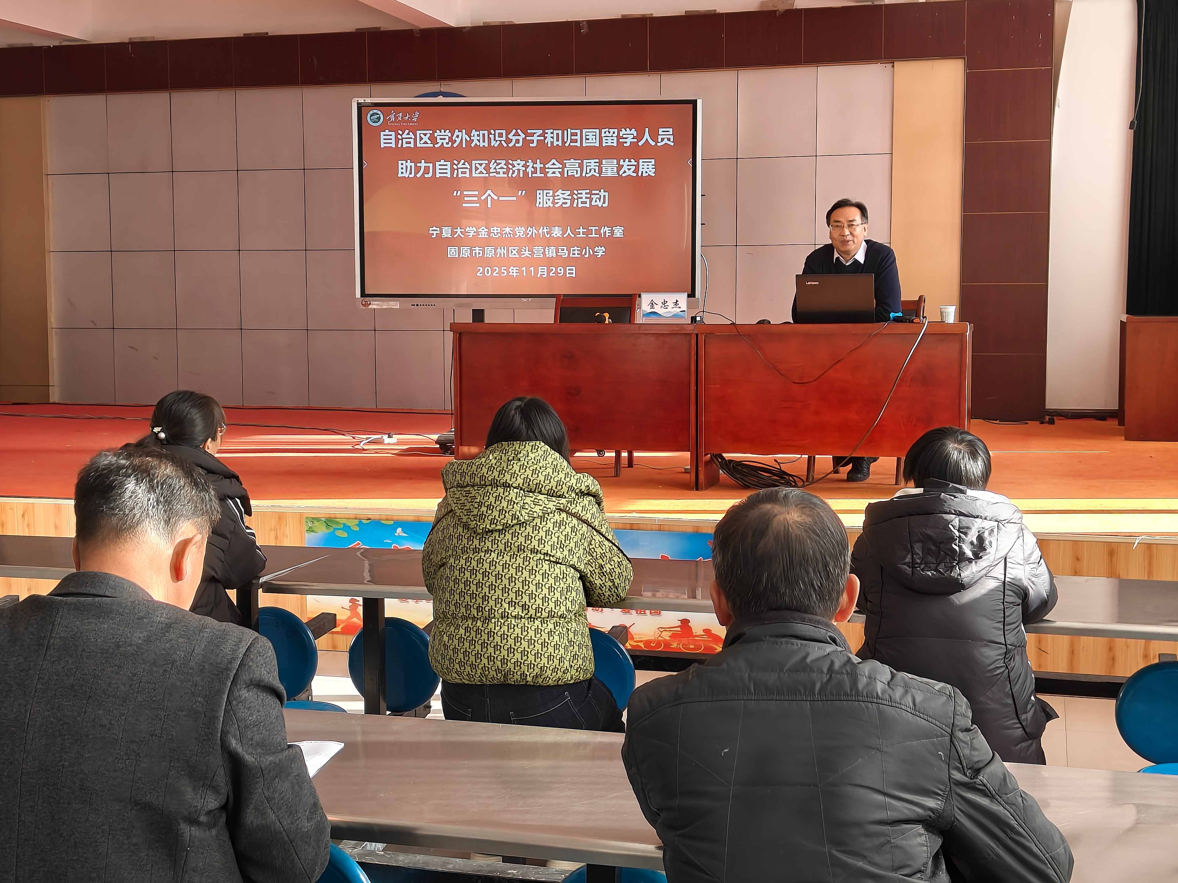 工作会前,bat365中文官方网站金忠杰党外代表人士工作室在马庄小学举行了自治区党外知识分子和归国留学人员助力自治区经济社会高质量发展“三个一”服务活动。自治区政协常委、bat365中文官方网站外国语学院副院长金忠杰教授围绕“铸牢中华民族共同体意识示范区建设与新时代中国式现代化宁夏篇章”,为头营镇部分学校教师作了专题讲座。