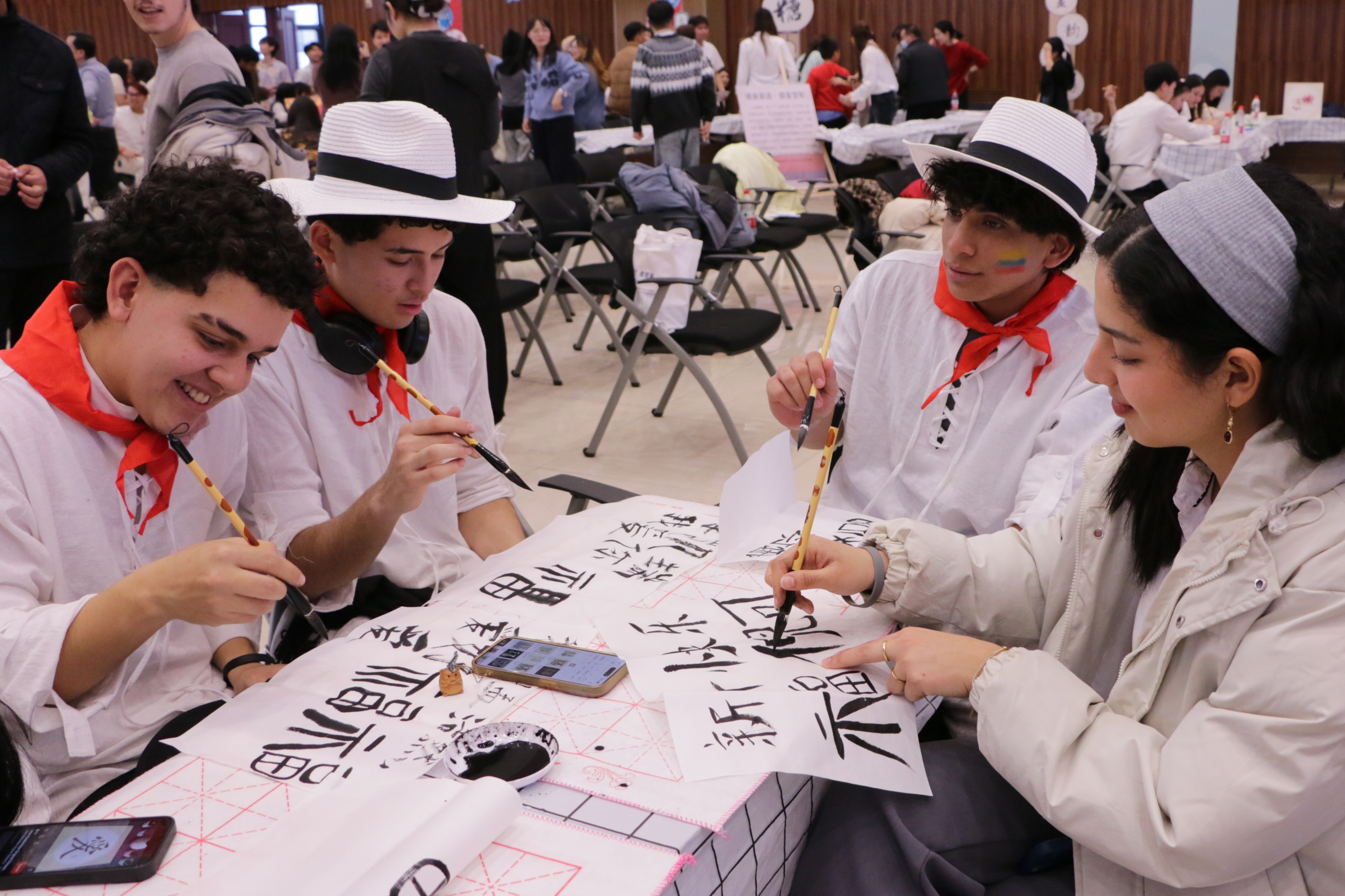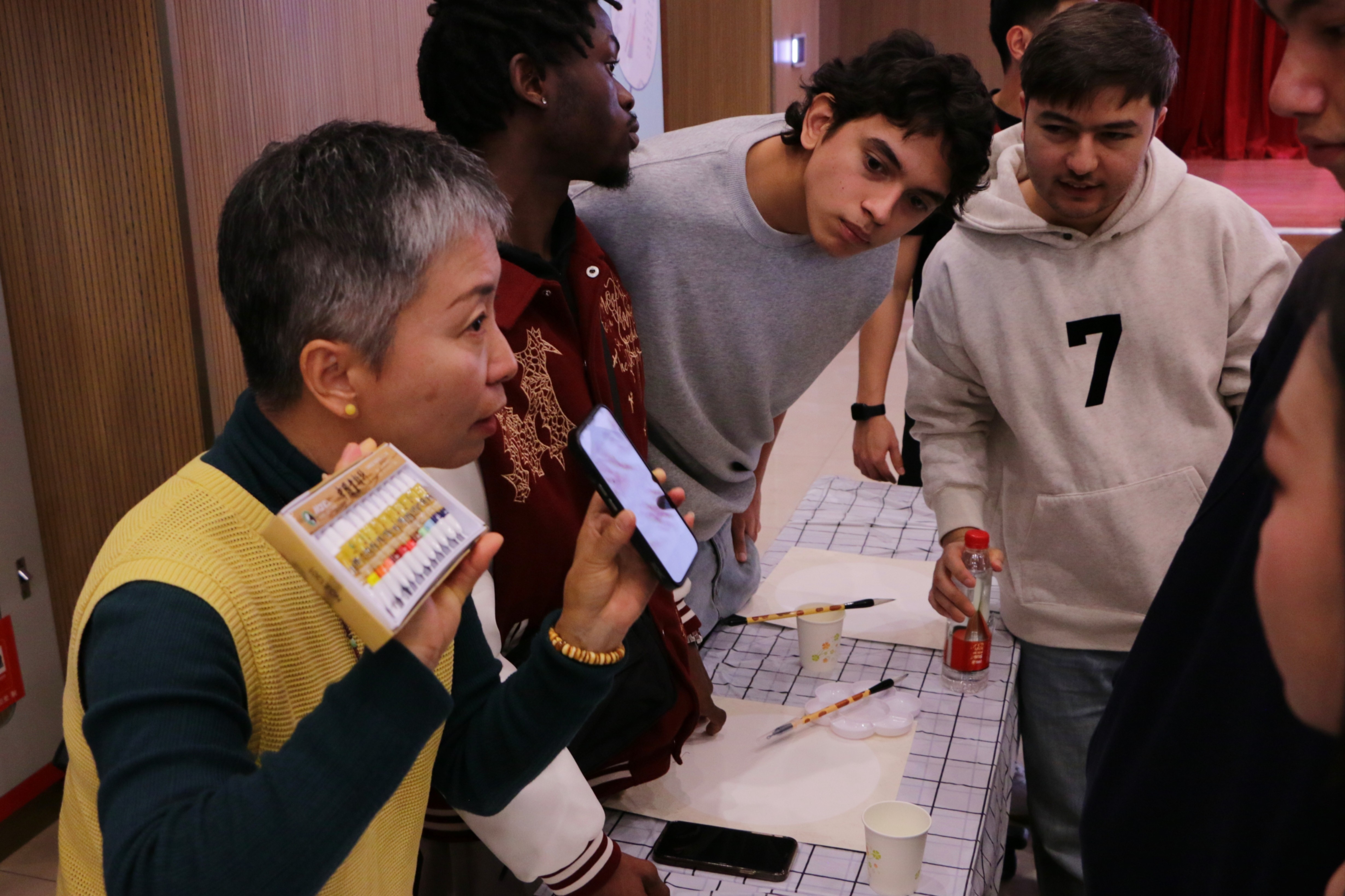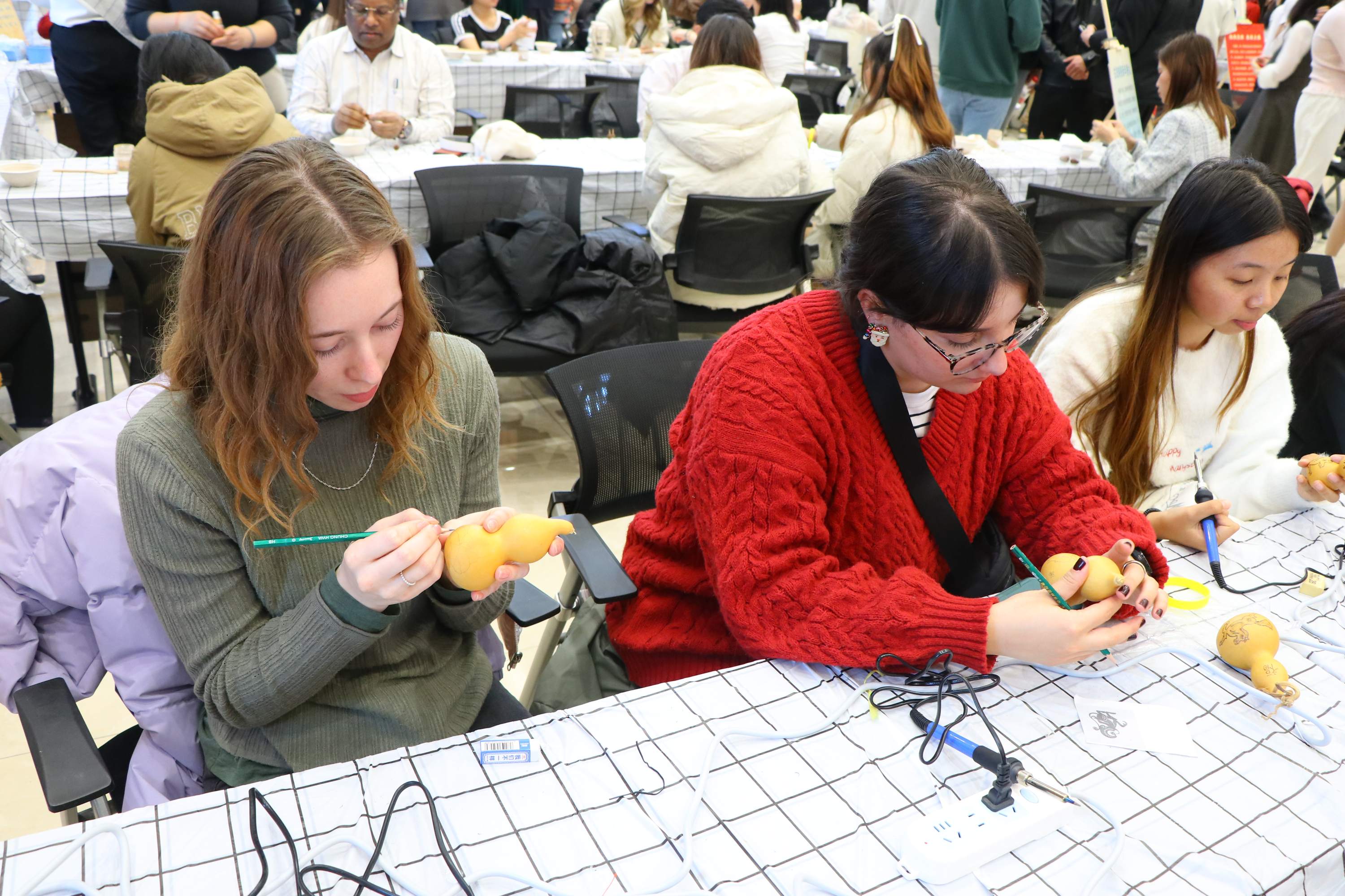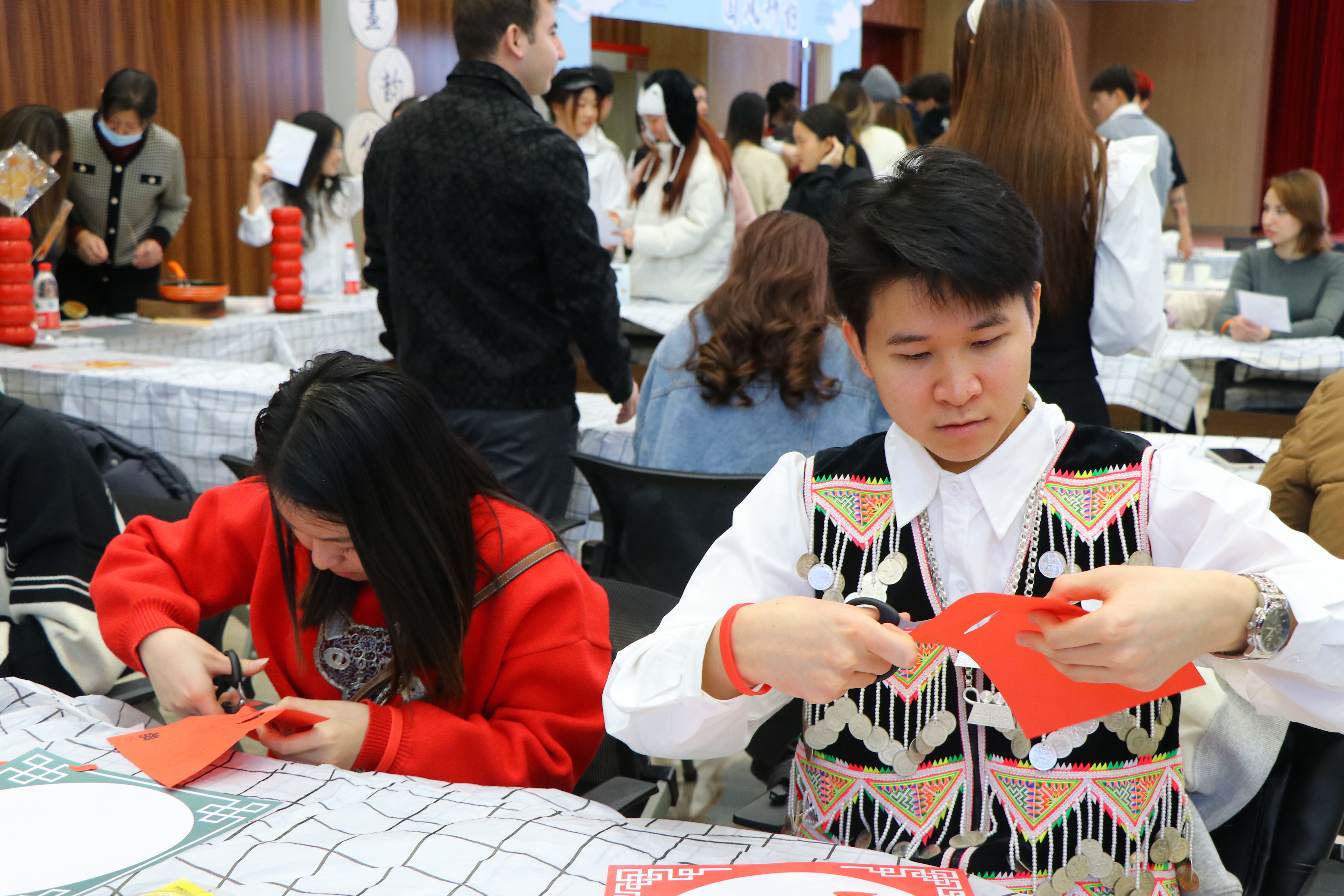 九大平行开放的非遗与文化体验工坊活动积极引导外籍师生从“旁观者”转变为“深度参与者”,在亲手创作中读懂中国。师生在“水墨丹青·国风新韵”工坊学习国画勾勒与晕染技法,感受笔墨间的气韵生动;在“巧手剪纸·光影叙事”工坊剪出个人星座或校徽图案,光影交错中展现剪纸艺术之美;在“古法制香·中药香丸”工坊亲手调配香粉、制作香丸,装入锦囊作为“幸运香囊”;在“生旦净丑·粉墨春秋”工坊绘制京剧脸谱,沉浸式体验戏曲魅力;在“经纬交织·吉祥之结”工坊编织中国结,在经纬交错中理解“吉祥如意”的文化寓意;在“墨韵新生·字绘青春”工坊用毛笔书写个人座右铭或梦想关键词,让书法承载青春寄语;在“糖画新语·甜蜜塑形”工坊以糖为墨,绘制具琥珀质感的糖画,感受不一样的甜美与温情;在“指尖面艺·创意食刻”工坊学习包饺子,在团圆寓意中感受中华饮食文化;在“人间烟火·绘烙葫芦”工坊以铁为笔、以火为墨,将葫芦上烙刻的吉祥纹样制成独具温度的装饰雅物。