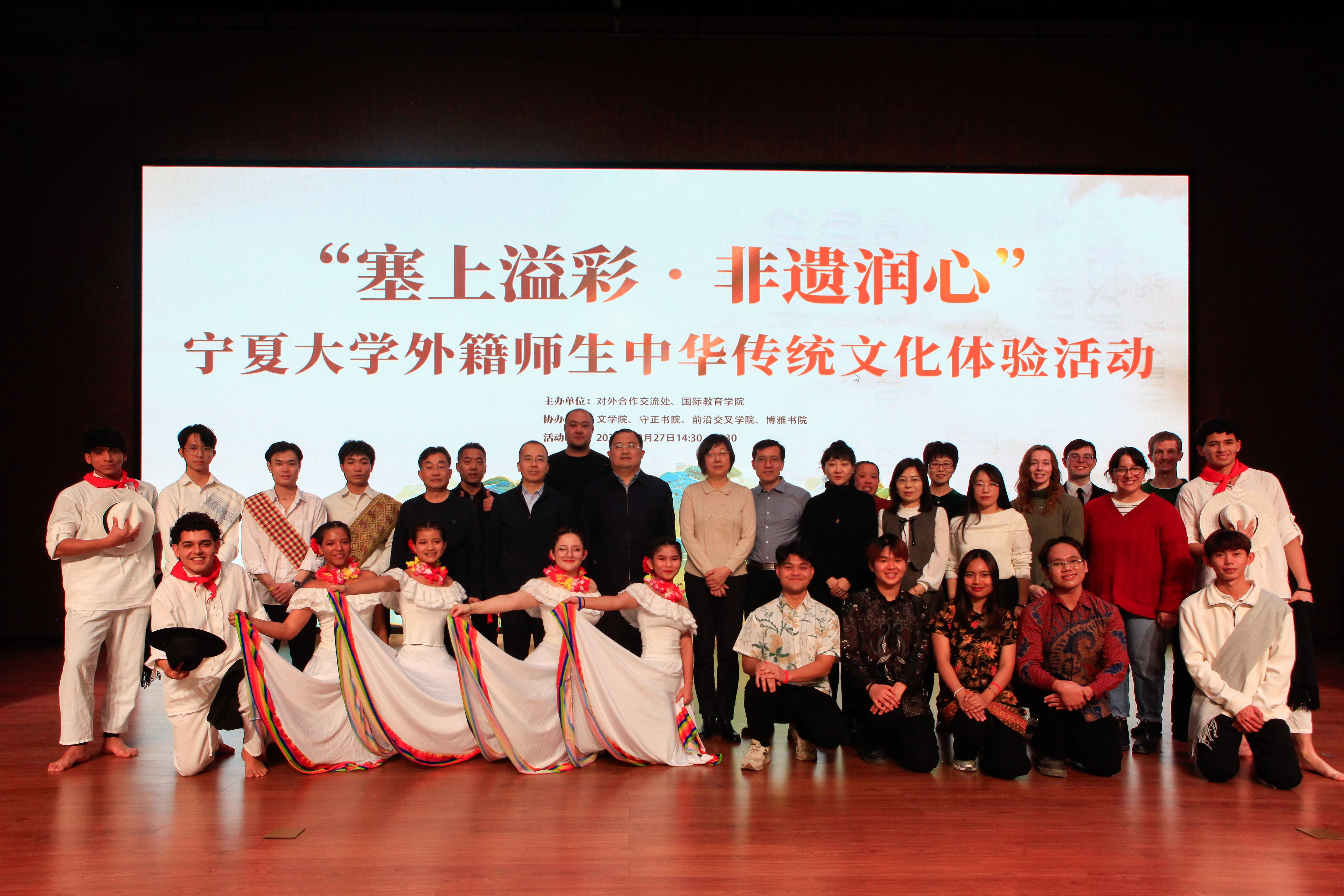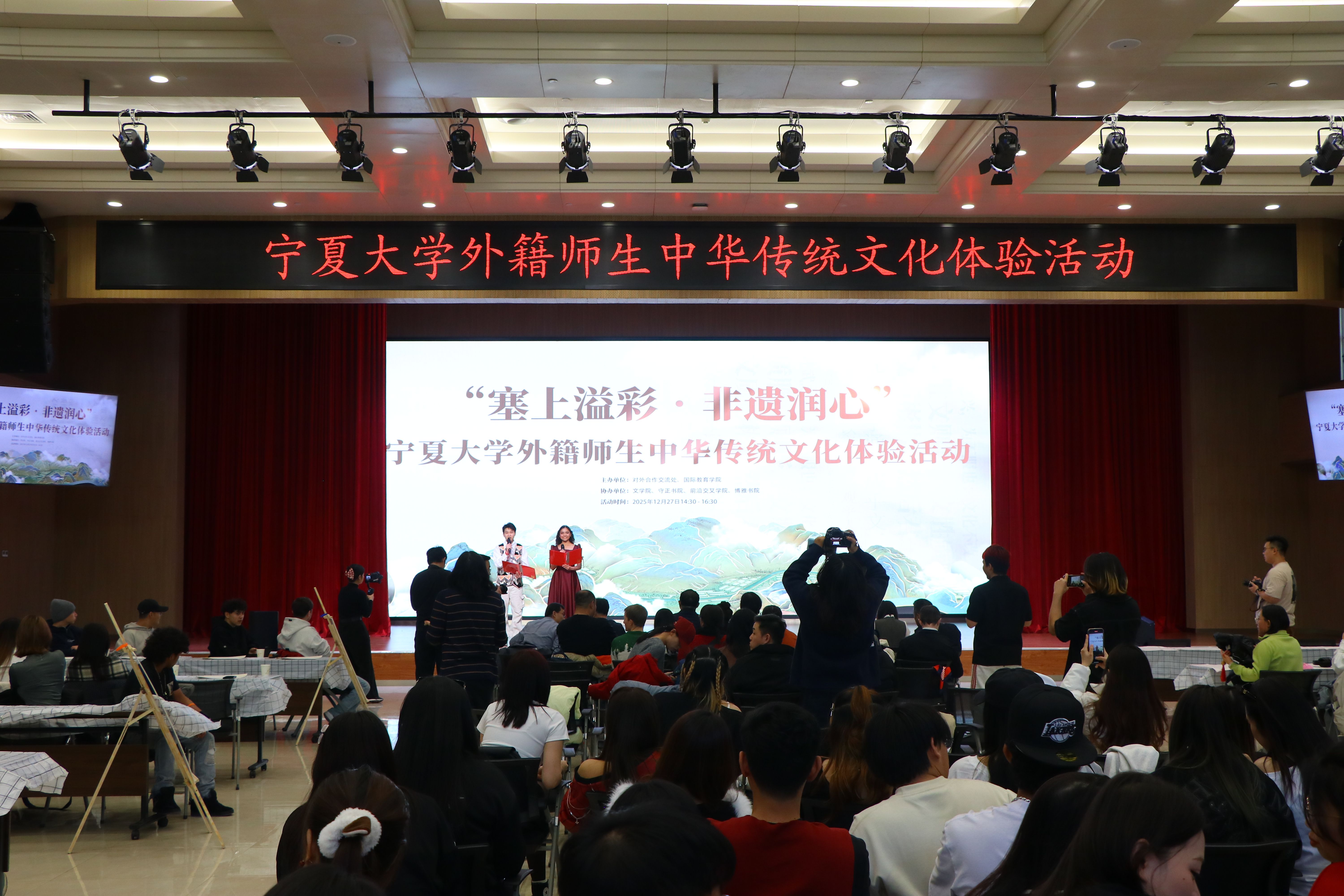 【bat365中文官方网站新闻中心讯 杨雯/文 杨雯 学生记者 田慧文 李紫东/图】12月27日下午,“塞上溢彩 非遗润心”外籍师生中华传统文化体验活动在贺兰山校区笃行楼三楼报告厅举办,280多名外籍师生共同感受中华传统文化的魅力,开启了一场别开生面的文化感知与交流之旅。活动由对外合作交流处、国际教育学院主办,守正书院、博雅书院、前沿交叉学院协办,校党委副书记韩惠丽,校党委常委、副校长杨文法参加活动。