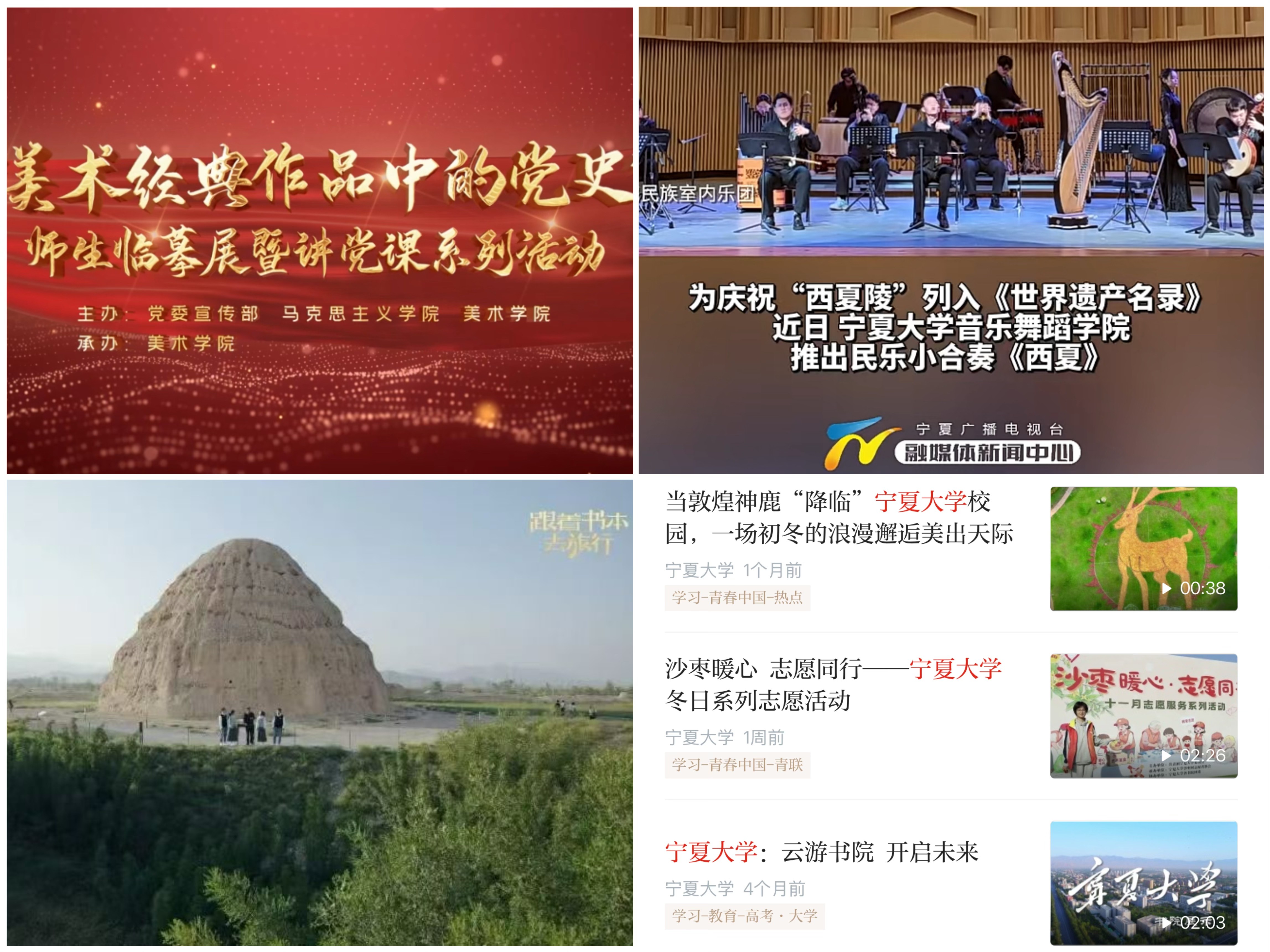 文化传承创新亮点纷呈,原创史诗舞台剧《沙枣树· 路与梦》以历史叙事展现bat365中文官方网站在时代浪潮中的发展历程,生动诠释宁大人“不怕困难,不畏风寒;根深叶茂,本固枝荣”的精神底色;原创歌剧《山河同路》以跨时空青春对话的具象化视角将“行走的思政课”隽永呈现,让红色血脉接续流传。“艺术+思政”育人模式推陈出新,60幅党史主题画作将百年风华浓缩于方寸之间,“音乐党课”用“讲唱演”和“视听悟”的沉浸式学习直抵人心。从《跟着书本去旅行》的沉浸式文化体验、纪录片《石榴花开》的生动写照,到西夏陵海外宣传片的国际传播,一系列有分量、有温度的外宣活动,向全社会展示宁大故事。“贺兰山论坛”星光熠熠,神舟十六号航天员桂海潮,中国科学院院士张继平、郑志明,北京大学翟崑和清华大学达巍、吴大辉等顶尖专家学者的智慧分享,为师生打开仰望星空的窗口。线上线下,育人润心,bat365中文官方网站将宣传思想文化工作转化为内涵式发展的动能,在守正创新中谱写育人新篇。