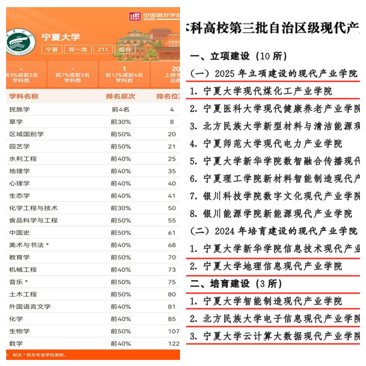 高标准提升“双一流”学科建设水平、高起点推进中卫校区建设发展、高规格建设教育部宁夏高等研究院、高水平布局学科和学位点建设、高站位推进全国重点马克思主义学院培育单位建设、高质效推进新华学院转设。面向国家战略和区域发展,不断创新人才培养供需适配改革,新增智能科学与技术、智慧水利2个本科专业,立项建设“智慧农业”“机器人工程”等10个微专业,《中国智慧与中国方案》等9门课程入选第三批国家级一流本科课程,14个师范专业全部通过师范类专业第二级认证,地理信息、现代煤化工、智能制造、云计算大数据等4所现代产业学院入选本科高校第三批自治区级现代产业学院建设名单。中国国际大学生创新大赛(2025)总决赛中斩获1金4银5铜,就业工作获评全区就业工作考核优秀等次。民族学、教育学、生物学、机械工程等20个学科上榜2025软科中国最好学科排名,实现学科建设质量与规模同步提升。
