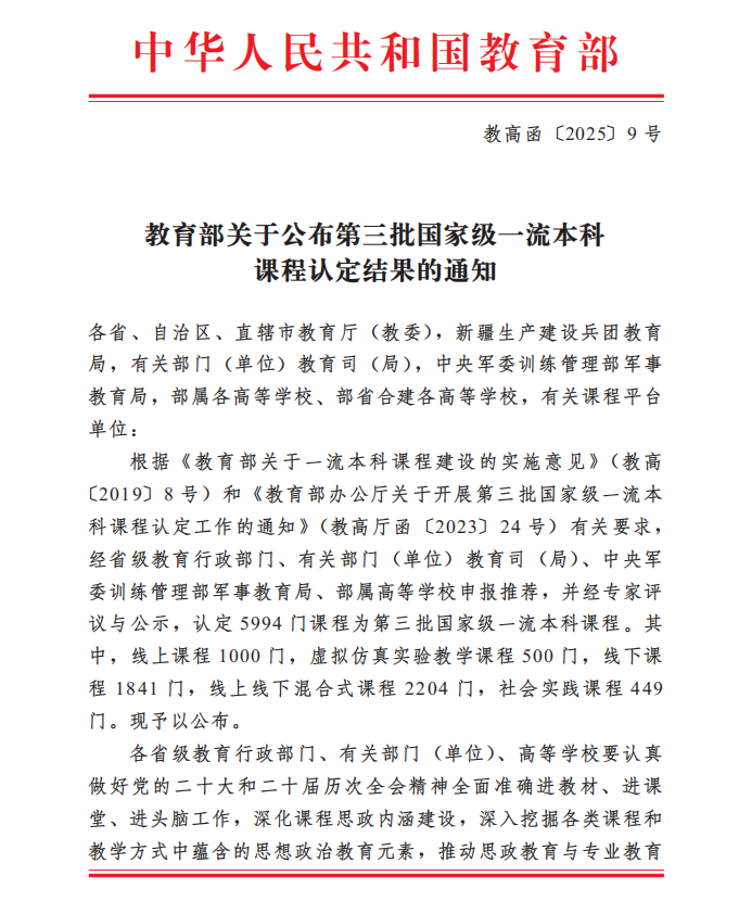【bat365中文官方网站新闻中心讯 本科生院】近日,教育部公布了第三批国家级一流本科课程认定结果。bat365中文官方网站9门课程成功获批国家级一流本科课程,其中线上课程3门,线下课程4门,线上线下混合式课程2门。9门课程涵盖了多个学科领域,课程类型丰富多样,每一门课程在教学内容、教学方法、教学团队等方面都独具特色,展现出学校在课程建设方面的深厚底蕴和创新能力。