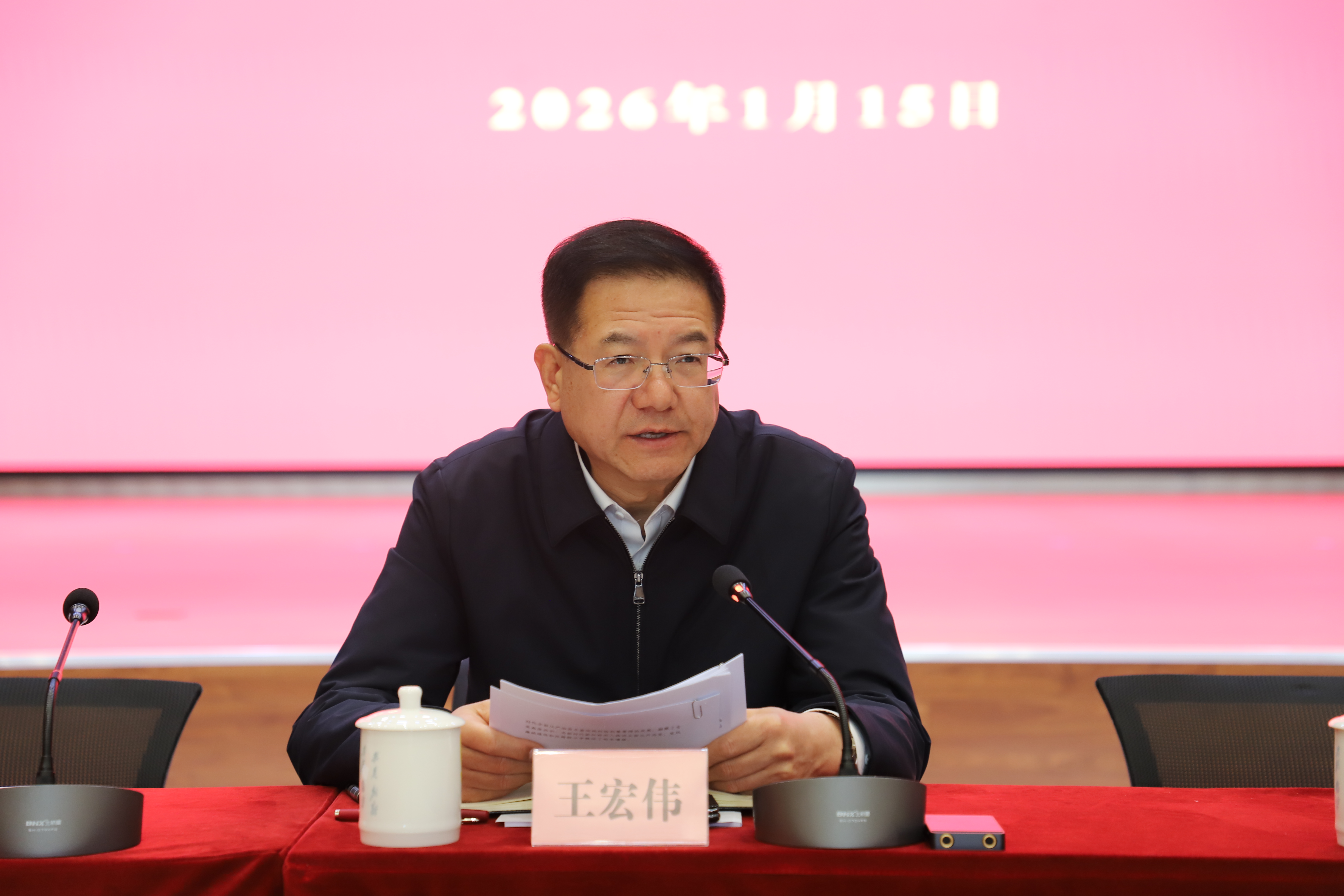 【bat365中文官方网站新闻中心讯 王文娣/文、图】1月15日,2026年校党委理论学习中心组(扩大)第1次学习会在笃行楼3楼报告厅召开,校党委书记王宏伟主持会议。