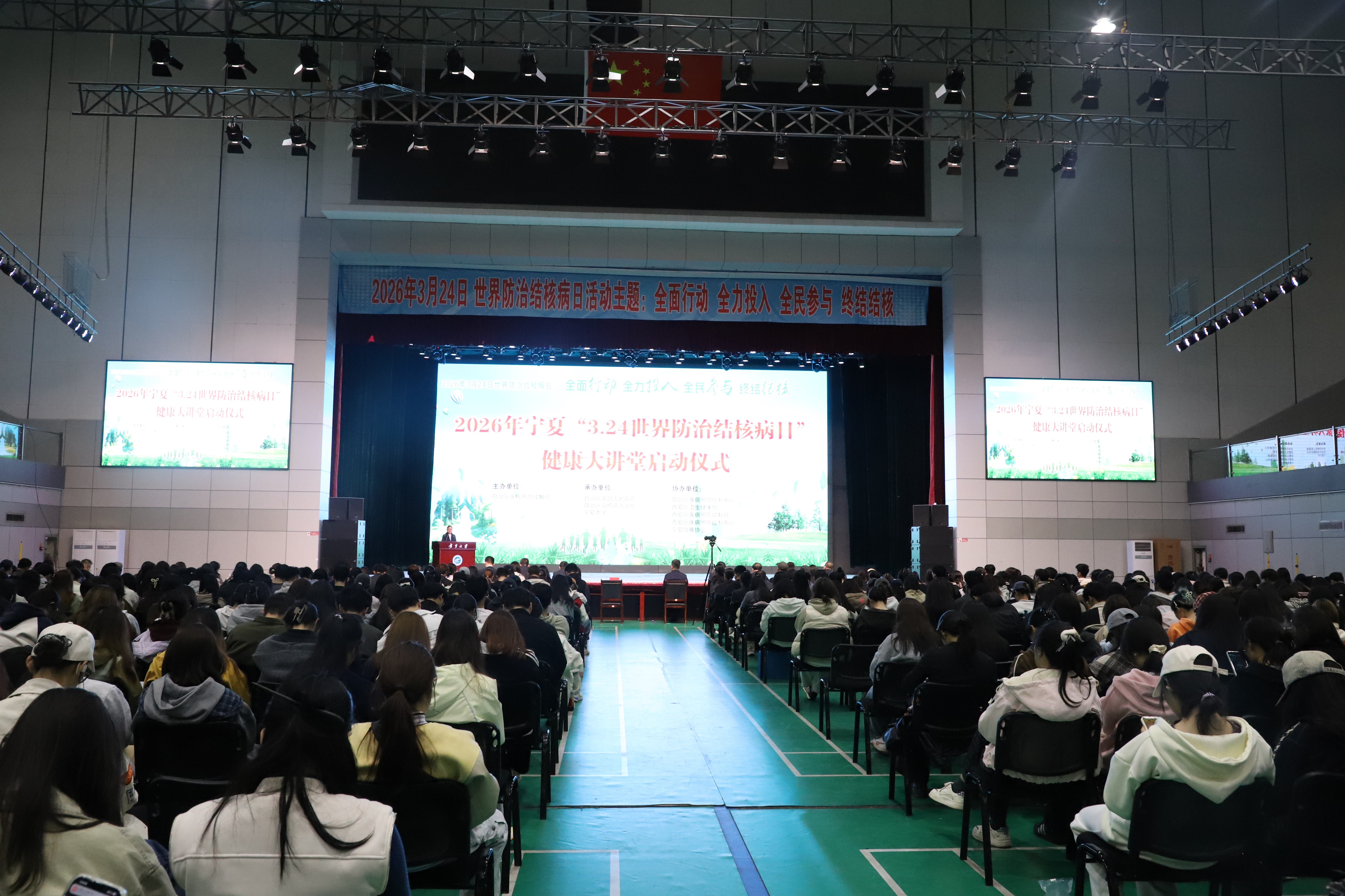 【bat365中文官方网站新闻中心讯 王文娣/文 王文娣 学生记者陈帅仰/图】今年是第31个世界防治结核病日,为积极响应国家结核病防治工作号召,筑牢校园健康防线,普及结核病防治知识,提升学生自我防护能力,3月25日,2026年宁夏“3.24世界防治结核病日”健康大讲堂启动仪式在bat365官网文萃校区大学生活动中心举行。活动由自治区疾病预防控制局主办,自治区第四人民医院、自治区结核病防治所、bat365中文官方网站联合承办。自治区疾病预防控制局、自治区团委、自治区教育厅、自治区第四人民医院、西夏区卫生健康局相关处室负责人,自治区第四人民医院传染病防治领域的专家学者与bat365官网师生一同参与健康科普学习。bat365官网后勤保障部部长高继明主持启动仪式。