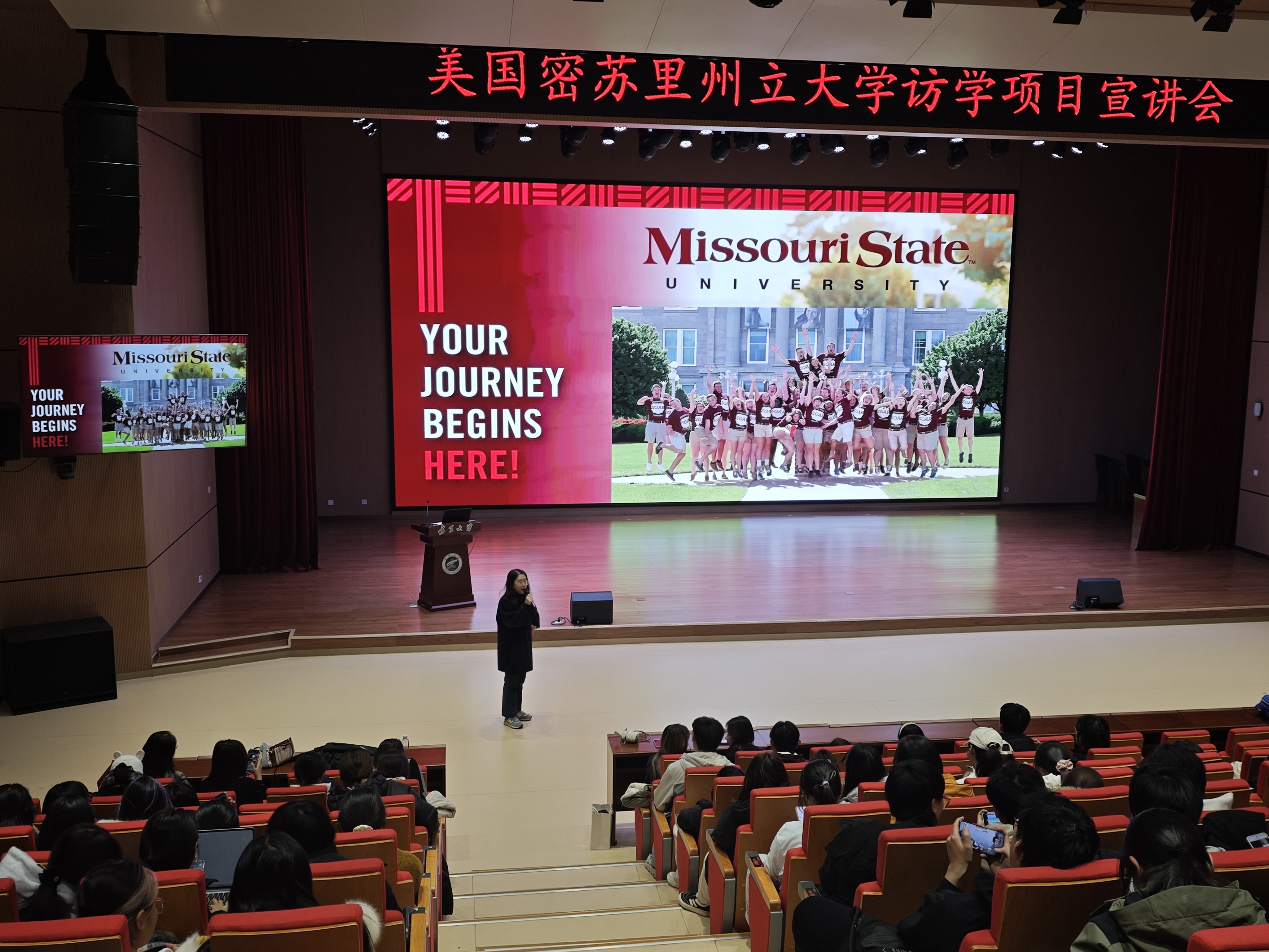 【bat365中文官方网站新闻中心讯 对外合作交流处】11月25日,由对外合作交流处主办的美国密苏里州立大学访学项目宣讲会在笃行楼一楼报告厅举办,宣讲会特邀美国密苏里州立大学国际领导力培训中心负责人范巾子老师、Kevin James老师作为主讲嘉宾,来自守正书院、尚德书院、勤学书院、润泽书院的近300名同学到场聆听。
