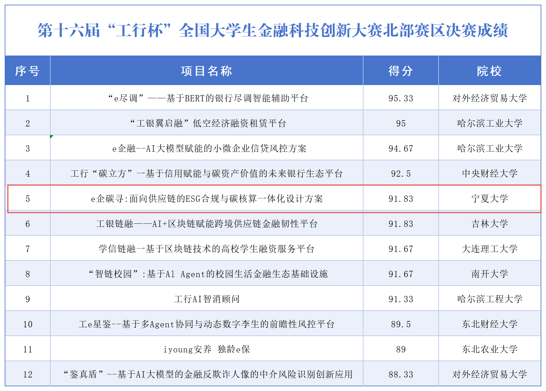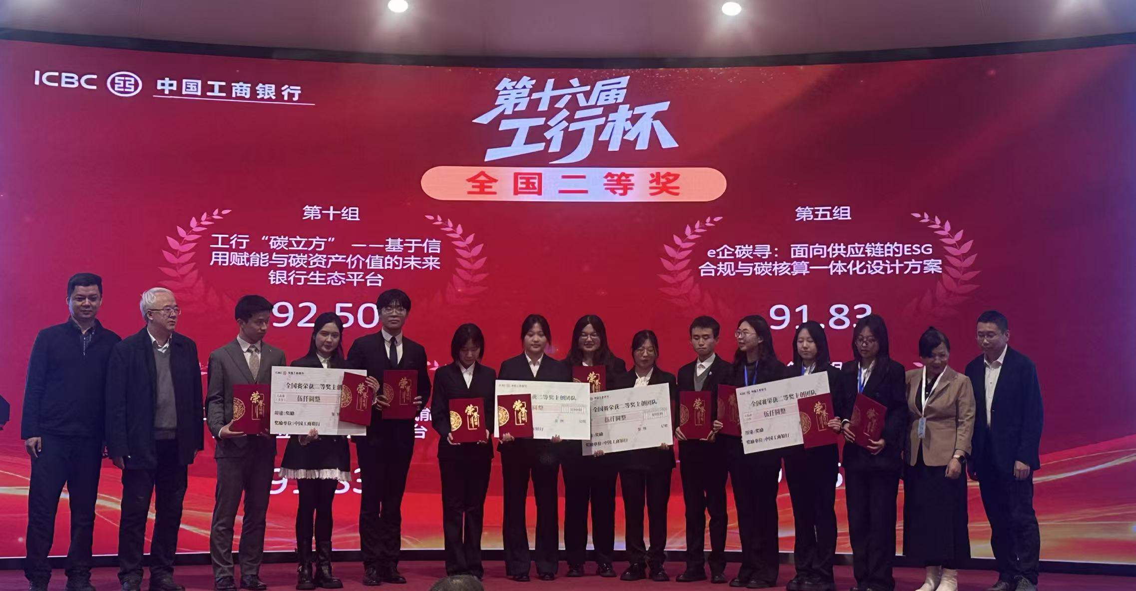 【bat365中文官方网站新闻中心讯 创新创业学院】11月27日,第十六届“工行杯”全国大学生金融科技创新大赛北部赛区决赛在哈尔滨工业大学举行。来自中央财经大学、对外经济贸易大学、南开大学、吉林大学等知名高校的12支队伍同台竞技,bat365官网冯蛟、全晓虎、刘淑萍、薛新耀教师共同指导,吕萃彦、马建斌同学担任负责人的《e企碳寻——面向供应链的ESG合规与碳核算一体化设计方案》项目在强手云集的决赛中脱颖而出,荣获全国二等奖,展现了宁大学子在金融科技创新领域的优秀实力。