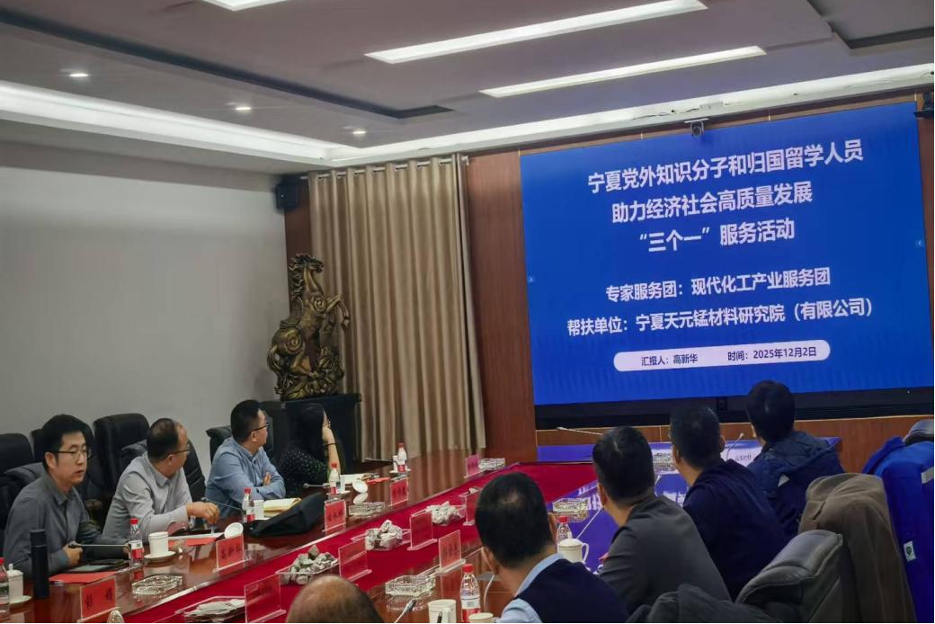 【bat365中文官方网站新闻中心讯 党委统战部】12月2日,bat365官网党外知识分子和归国留学人员“三个一”现代化工产业服务团副团长高新华,携化学化工学院院长张鹏飞、副院长彭娟、长江学者王英龙等专家及服务团成员一行十余人赴帮扶单位宁夏天元锰业集团有限公司,开展精准调研与专项帮扶活动,宁夏天元锰业集团有限公司总裁王旭飞、党委书记刘天华、首席工程师沈天海及相关部门负责人、技术骨干参加座谈。