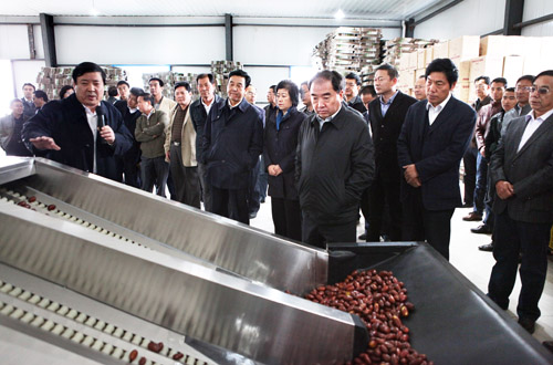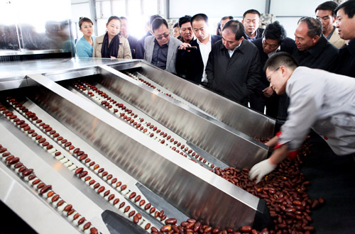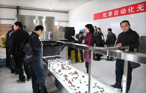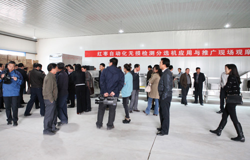 在灵武果业公司车间,与会人员现场查看了红枣自动化无损检测分选机应用情况。听取了项目主持人何建国教授关于设备使用情况的介绍。观摩中,与会人员分别从各自角度对红枣自动化无损检测分选机给予高度评价。