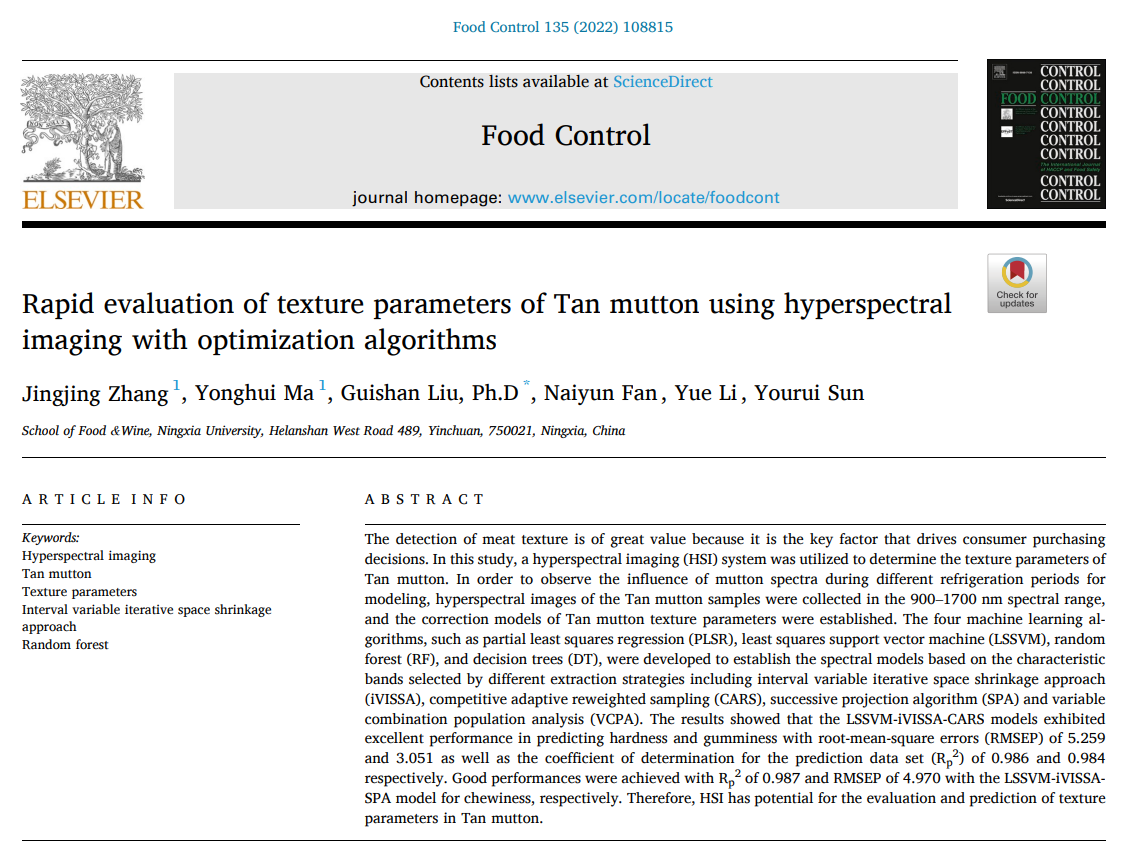 【bat365中文官方网站新闻中心讯 食品与葡萄酒学院】3月10日,食品与葡萄酒学院2019届硕士研究生张晶晶(第一作者)、刘贵珊教授(通讯作者)在《Food Control》(IF为6.652,一区TOP期刊)杂志上发表的高水平论文“Rapid evaluation of texture parameters of Tan mutton using hyperspectral imaging with optimization algorithms”(2022年1月5日出版,135卷)被遴选为ESI数据库高被引论文。