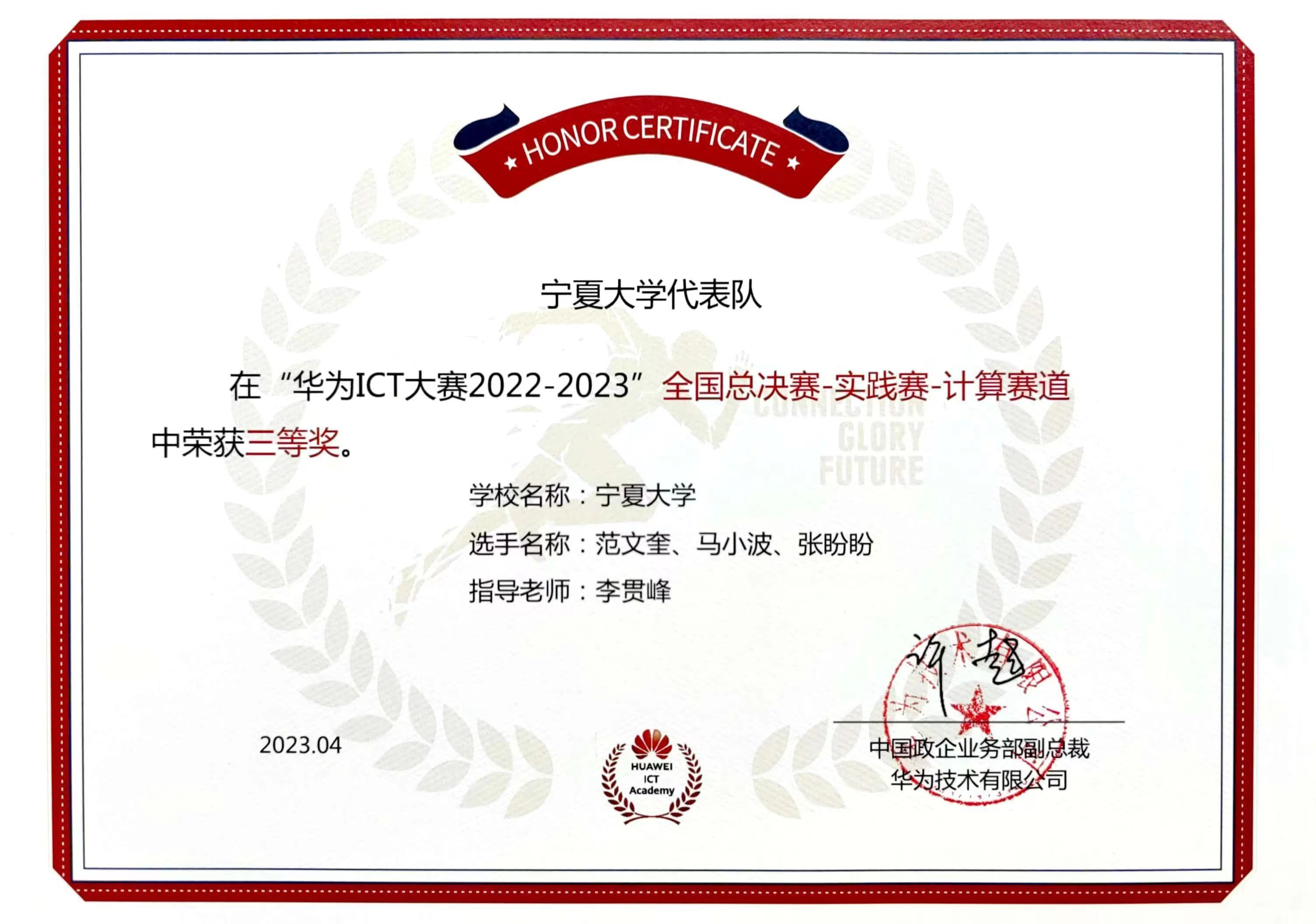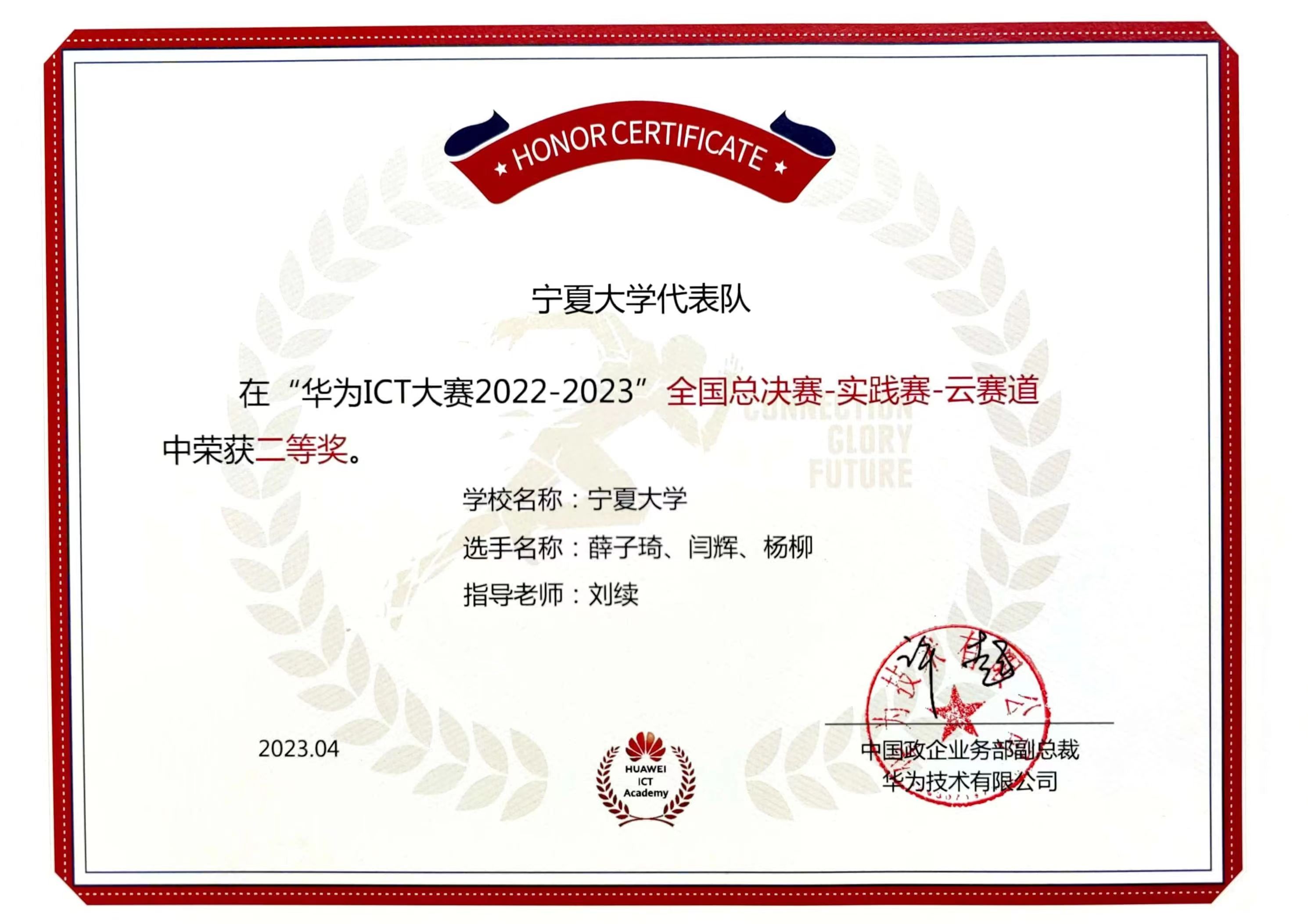 【bat365中文官方网站新闻中心讯 信息工程学院】“全球决赛三等奖,实现宁夏7年来该项赛事奖牌零的突破”,由信息工程学院刘续老师指导,薛子琦、杨柳、闫辉3名同学组成的参赛队在5月27日华为ICT大赛2022-2023全球总决赛(本科组云赛道)上获得的佳绩。