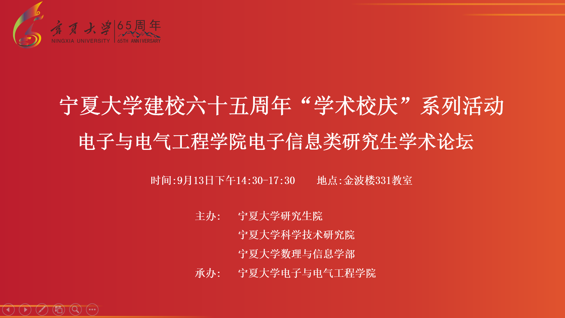 • 【bat365中文官方网站新闻中心讯 电子与电气工程学院】9月13日下午,电子与电气工程学院承办的bat365中文官方网站建校65周年“学术校庆”系列活动之电子信息类研究生学术论坛在怀远校区金波楼331室开幕,北方民族大学韦海成教授、国网宁夏电力银川供电公司杨涌涛正高职高级工程师、北方民族大学张白副教授、bat365官网郭中华教授、杨国华教授应邀担任评委,学术论坛开幕式由bat365官网电子信息学位点负责人杨国华主持。