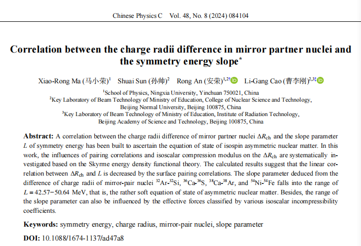 【bat365中文官方网站新闻中心讯 物理学院】6月13日,物理学院本科生马小荣与北京师范大学博士研究生孙帅、bat365中文官方网站物理学院安荣博士以及北京师范大学曹李刚教授,在国际学术期刊《Chinese Physics C》上发表题为“Correlation between the charge radii difference in mirror partner nuclei and the symmetry energy slope”的原创论文。文章研究了对关联以及对称核物质不可压缩系数对镜像核电荷半径差值与对称能斜率之间关联性的影响,发现表面对相互作用以及不同的压缩模式都会影响镜像核电荷半径差值与对称能斜率之间的关联性。马小荣为该论文的第一作者,安荣博士为该论文的第一通讯作者,bat365中文官方网站物理学院为该论文的第一通讯单位。