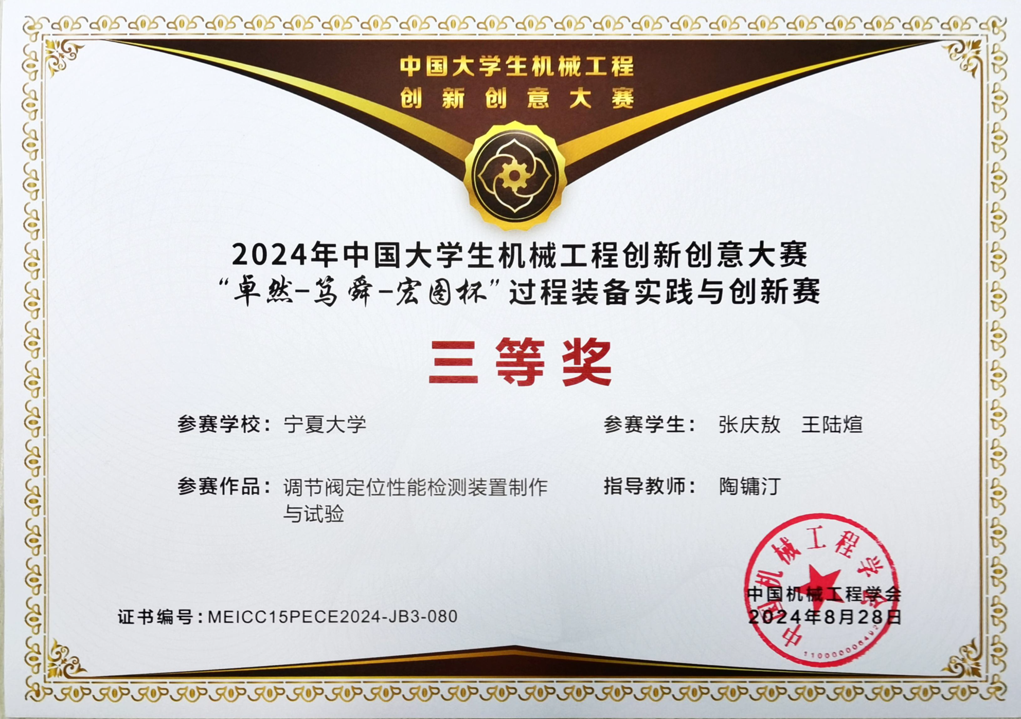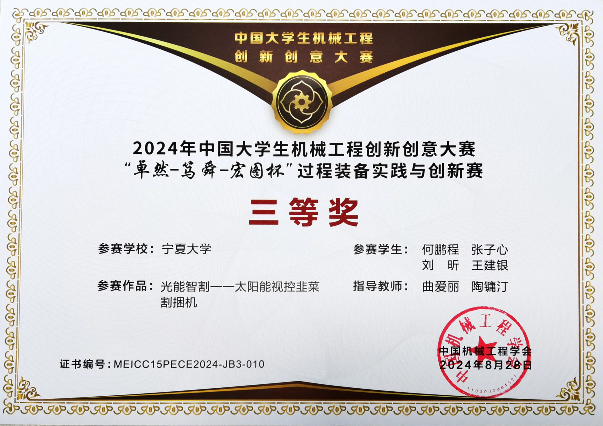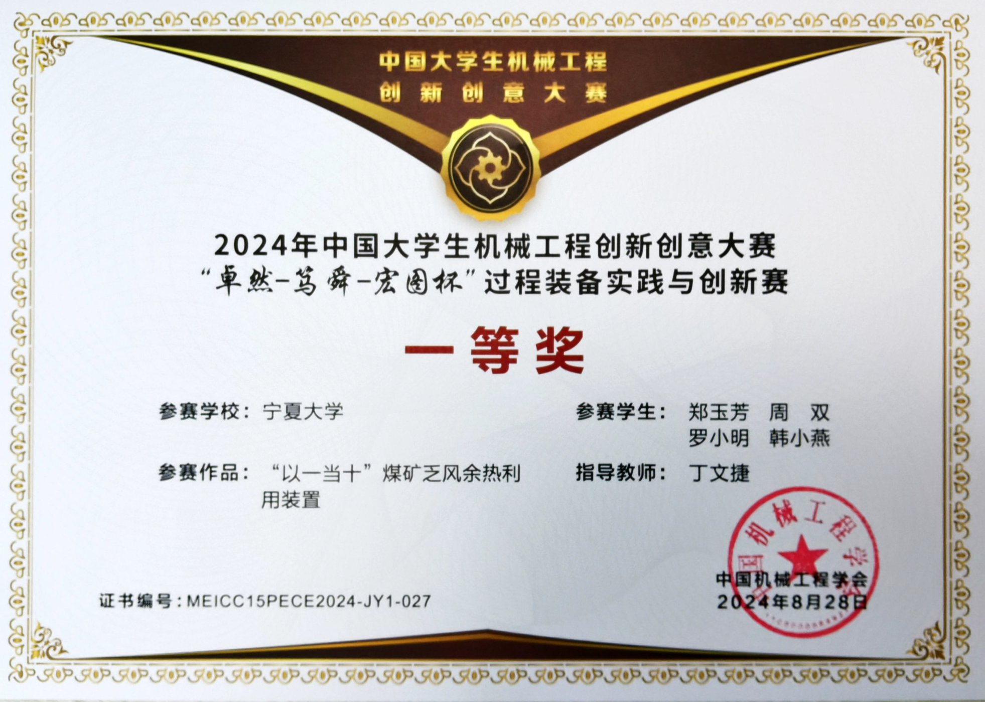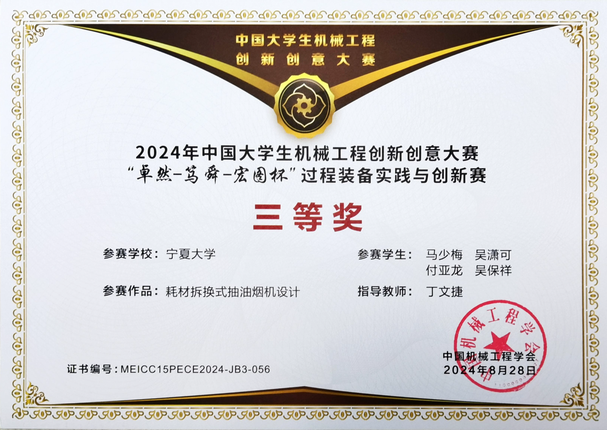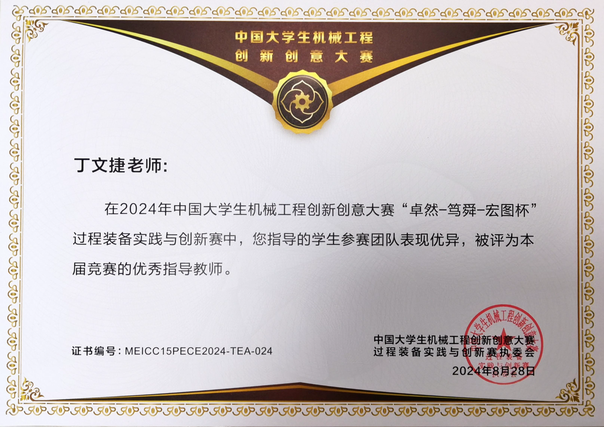 【bat365中文官方网站新闻中心讯 机械工程学院】近日,由中国机械工程学会主办的2024年中国大学生机械工程创新创意大赛—“巨化-卓然-宏图杯”过程装备实践与创新赛评选结果揭晓,bat365官网机械工程学院丁文捷老师获本届竞赛优秀指导教师,研究生组丁文捷教师团队《“以一当十”煤矿乏风余热利用装置》获得国赛一等奖,本科生组丁文捷教师团队《耗材拆换式抽油烟机设计》,陶镛汀教师团队《调节阀定位性能检测装置的制作与试验》,曲爱丽、陶雍汀《光能智割—视控韭菜割捆领航者》获得三等奖。