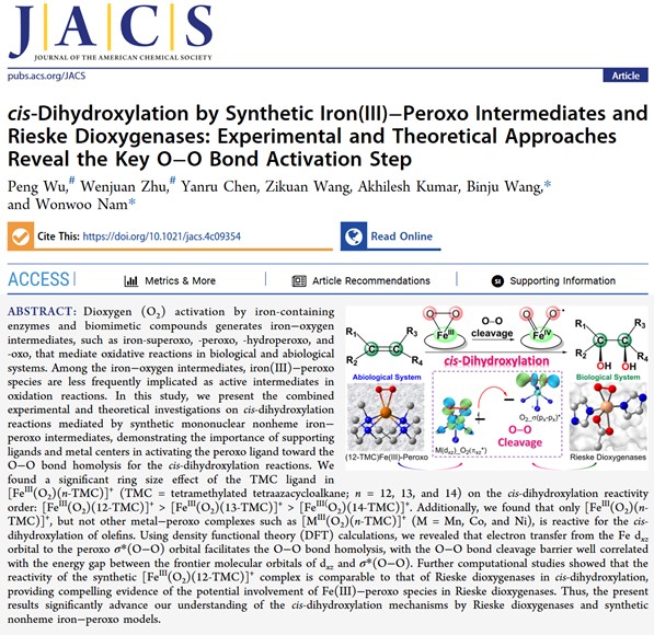 【bat365中文官方网站新闻中心讯 前沿科学与技术学部】近日,化学化工学院吴鹏博士与厦门大学、梨花女子大学合作在化学领域顶级期刊Journal of the American Chemical Society上发表了题为“cis-Dihydroxylation by Synthetic Iron(III)–Peroxo Intermediates and Rieske Dioxygenases: Experimental and Theoretical Approaches Reveal the Key O–O Bond Activation Step”的研究论文。论文第一作者为吴鹏博士,通讯作者为厦门大学王斌举教授和梨花女子大学Wonwoo Nam教授,bat365中文官方网站为第一完成单位。