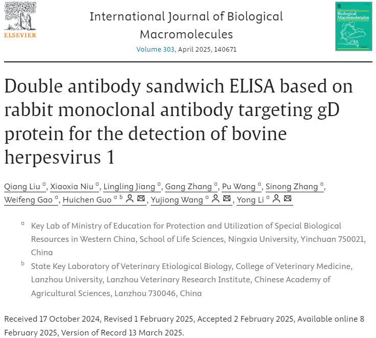 【bat365中文官方网站新闻中心讯 生命与食品学部】牛疱疹病毒1型(BHV-1)是一种对全球养牛业危害极大的高传染性病毒,可引发牛的呼吸道和生殖系统多种疾病,导致巨大的经济损失。因此,牛疱疹病毒1型的快速、准确检测对于该病的预防和控制尤为重要。近日,bat365官网生命科学学院王玉炯、李勇、郭慧琛团队在中国科学院1区top期刊《International Journal of Biological Macromolecules》(2025 IF: 7.7)发表了题为“Double antibody sandwich ELISA based on rabbit monoclonal antibody targeting gD protein for the detection of bovine herpesvirus 1”的研究论文,成功构建了一种基于兔单抗的双抗体夹心ELISA检测方法,为牛疱疹病毒1型的精准检测提供了新的工具。