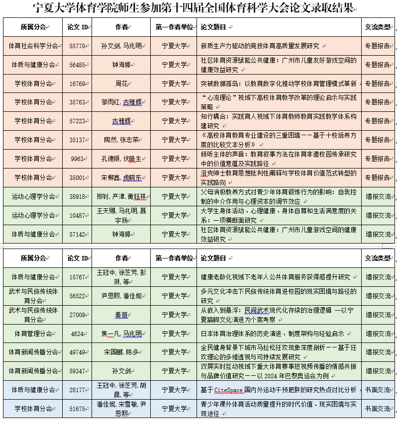【bat365中文官方网站新闻中心讯 体育学院】近日,第十四届全国体育科学大会论文录取结果公示,体育学院师生共有19篇学术论文获得录用,其中,专题报告8篇,墙报交流9篇,书面交流2篇。