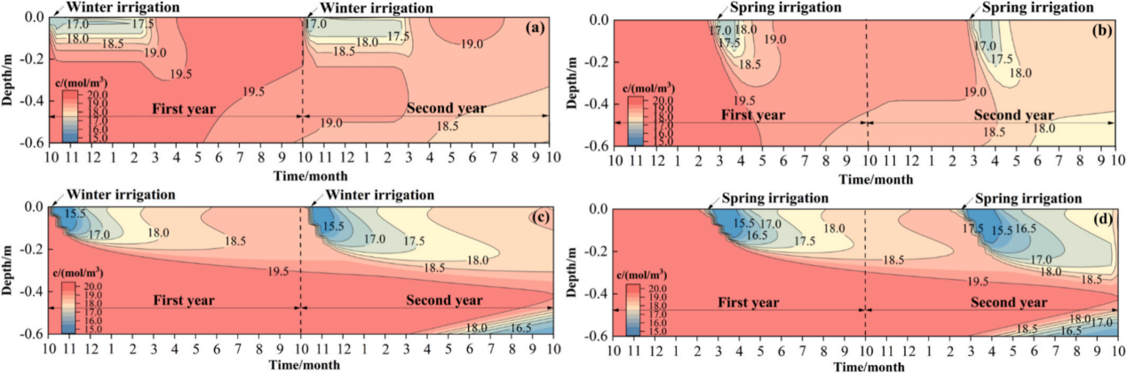 冬灌/春灌盐分浓度等值线图(ab-有冻融循环;cd-无冻融循环)