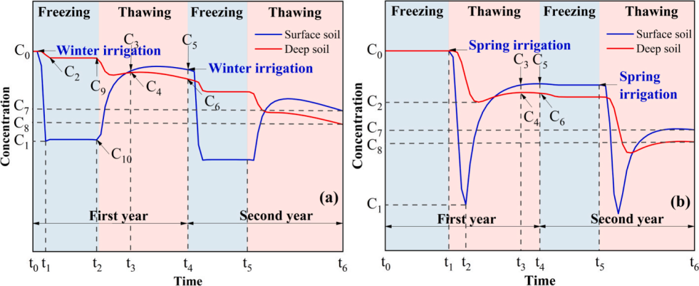 该研究聚焦于宁夏典型盐渍化区冻融季节的土壤水盐运移问题,针对冬灌与春灌条件下盐分运移规律尚不清晰这一难题,构建了考虑相变的水-热-盐耦合数值模型,并结合室内冻融试验进行验证。在研究过程中,团队系统分析了灌水定额、地下水埋深和土壤质地等因素对盐分运移的综合影响。结果表明,冻融作用显著加速了盐分在土壤表层的聚集,对比了冬/春灌盐分变化过程,冬灌更有利于浅层脱盐,而春灌在深层土壤表现出更高的脱盐效率;地下水位升高会显著降低脱盐效果,不同质地土壤则呈现出差异化的盐分淋洗路径。该研究成果不仅揭示了灌溉方式与冻融作用的相互作用机制,也为制定科学的灌溉制度和改良盐渍土田间管理提供了理论依据和实践参考。