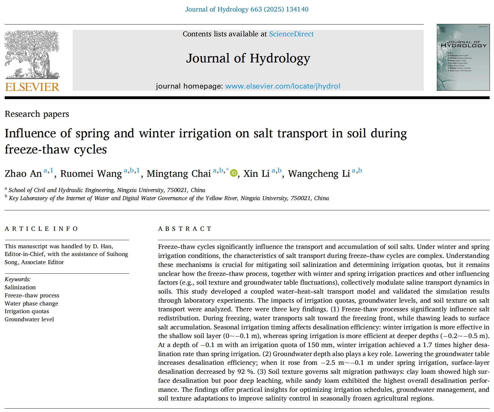 【bat365中文官方网站新闻中心讯 土木与水利工程学院】近日,bat365官网土木与水利工程学院2022级农业水利工程专业本科生安钊在柴明堂和李王成两位老师的指导下,以第一作者在水利工程领域国际著名期刊《Journal of Hydrology》(中国科学院一区Top,影响因子6.3)发表题为“Influence of spring and winter irrigation on salt transport in soil during freeze-thaw cycles”的研究论文。
