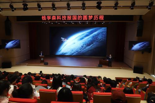 随后,钱永刚教授为与会师生作了题为“钱学森科技报国的圆梦历程”的讲座。讲述了钱学森科技报国的五次选择,诠释了钱学森赤胆忠诚的爱国情怀、敢为人先的创新精神、无私奉献的价值追求和卓尔不群的科学品质。在交流互动环节,同学们踊跃举手提问,钱永刚教授耐心而细致地解答每一个问题,现场气氛热烈。