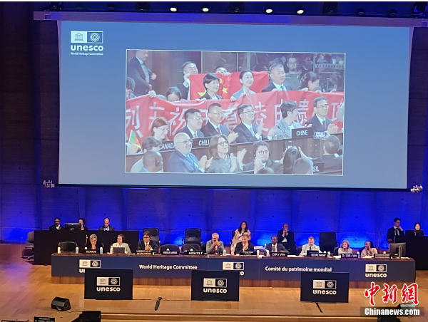北京时间7月11日,在法国巴黎召开的联合国教科文组织第47届世界遗产大会通过决议,将我国申报的“西夏陵”列入《世界遗产名录》。图为大会现场,中国代表团现场庆祝。 中国国家文物局供图
