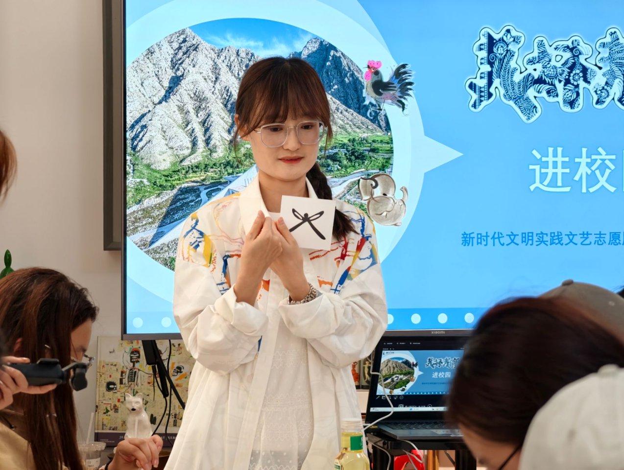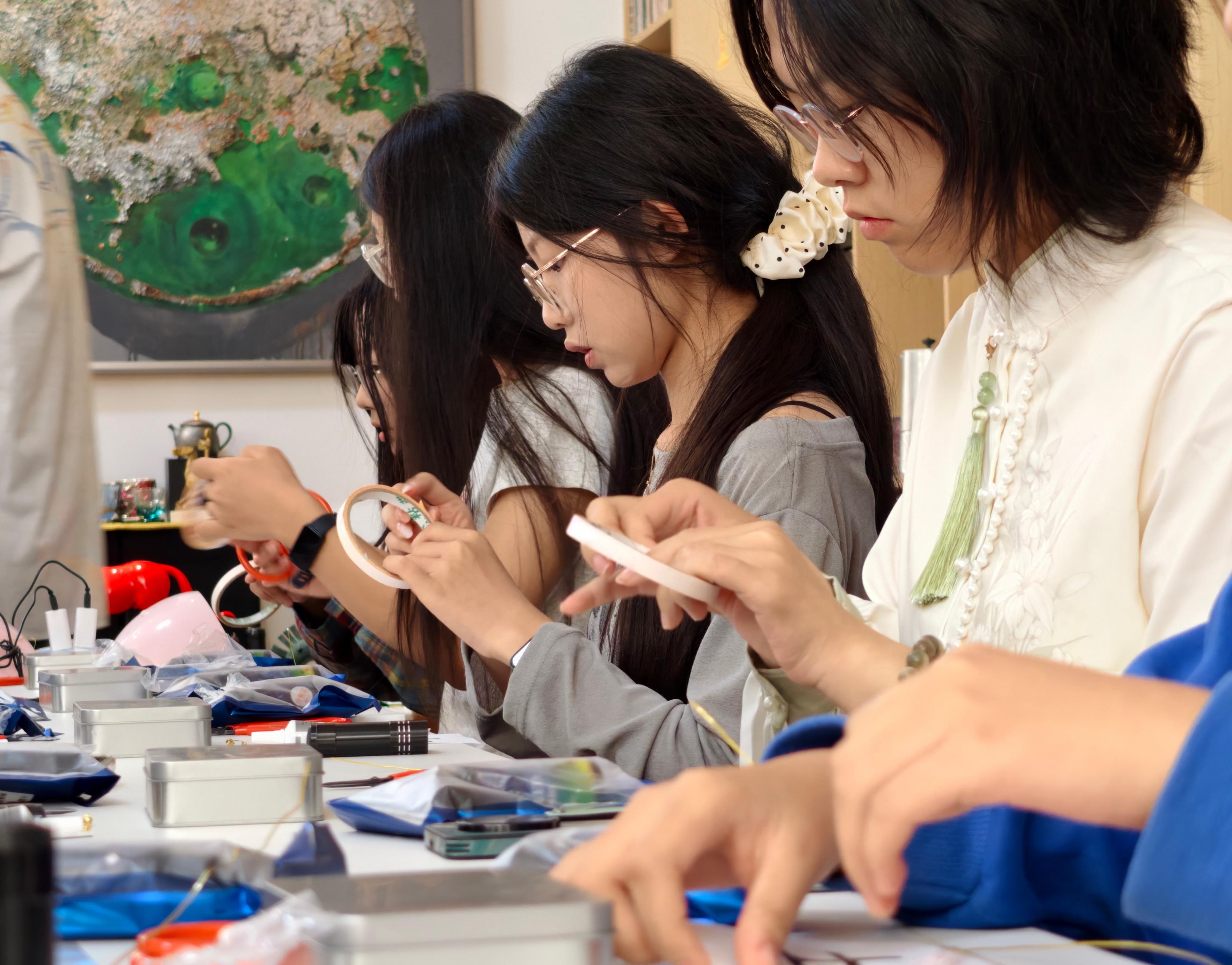 当天的活动,银川韩美林艺术馆的杨棣介绍了韩美林先生的艺术生平与成就,重点讲解了本次体验的螺钿工艺历史及本次作品形状来源。理论讲解后,手工老师张蕾现场演示制作流程,从掐丝、填螺片到凝固胶层,讲解细致,手法娴熟流畅,引得在场师生赞叹不已,跃跃欲试。