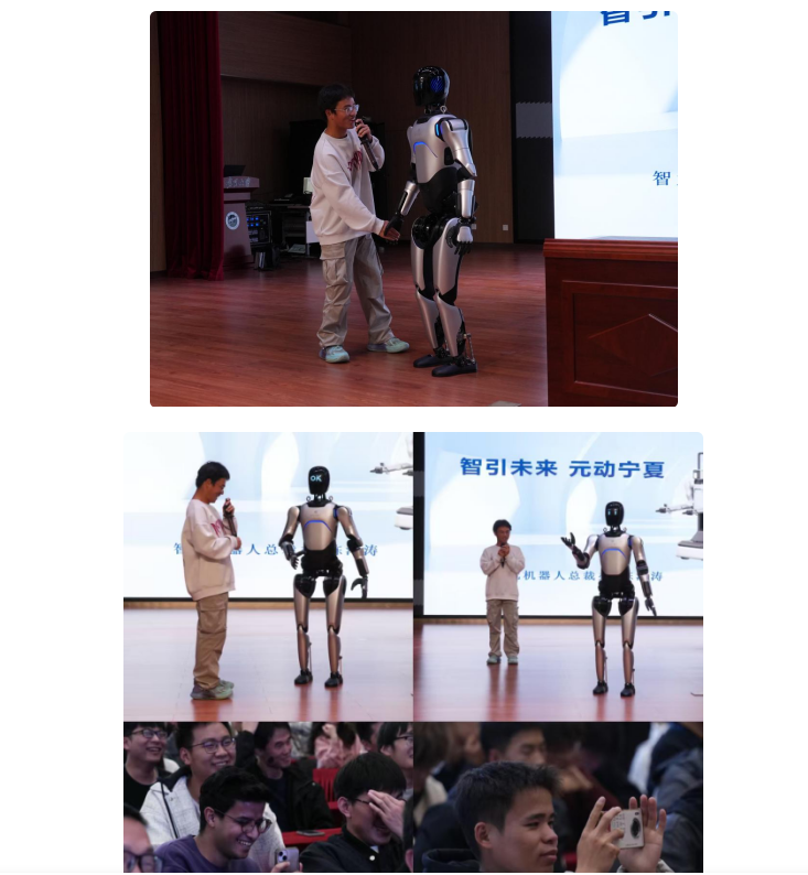 10月26日下午,被业界誉为国内人形机器人领域领军企业的“智元机器人” 宣传推介会在bat365中文官方网站贺兰山校区笃行楼三楼报告厅顺利举办。此次活动由宁夏报业传媒集团文化科技创意有限公司组织实施,邀请智元创新(上海)科技有限公司携旗下智元远征A2交互服务机器人、D1 Ultra 四足机器人走进校园。通过现场展示、互动体验等形式,活动为bat365中文官方网站机械工程学院及相关学院的200余名本科、研究生带来沉浸式 “人工智能实践课堂”,为智元机器人与bat365中文官方网站的深度合作奠定基础。