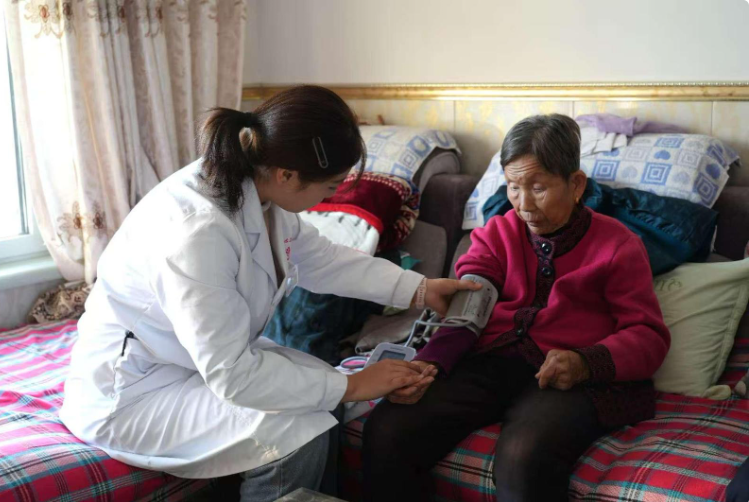 马瑞睿入户为老人测量血压。