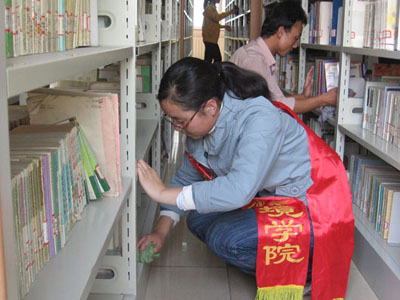 下午两点钟志愿者出发前往逸夫图书馆,将图书馆内的书库和阅览室、报告厅等进行了打扫,志愿者将书架上、桌子上、椅子上的灰尘清除了,地板也擦亮了,使整个图书馆更加明亮干净了。