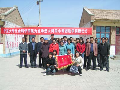【bat365中文官方网站新闻中心讯 生命科学学院】3月24日,生命科学学院志愿者分队在院党总支书记周强及部分老师的带领下,赴红寺堡开发区大河第四小学赠送由08级生物科学(1)班全体同学在3月16日开展的“情系贫困儿童”爱心募捐活动中所募捐到的物品。