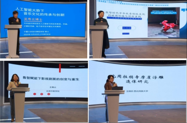 主旨报告环节,厦门大学谢清果教授倡导通过共生传播实践推动文明互鉴,为构建人类命运共同体提供本土化传播方案;重庆大学魏强教授从党的二十届四中全会关于新时代中国特色社会主义文化的阐释出发,指出“第二个结合”在数智时代文化传承中的重要意义;新消息报社武晓瑜结合文化遗产数字化实践案例,指出数字技术为传统文化视觉表达提供了新的可能;中央音乐学院吴粤北教授聚焦民族音乐传承与版权保护,以实例探讨数智时代音乐文化“守正创新”路径;北京舞蹈学院张朝霞教授结合非遗跨界项目,提出“文旅新空间”沉浸式体验的传统文化活化方案;北京印刷学院王艳云教授解析XR技术对舞台艺术的创新赋能;西北民族大学王晓珍教授则从艺术审美视角,阐释北周拉梢寺摩崖浮雕造像的文化价值。