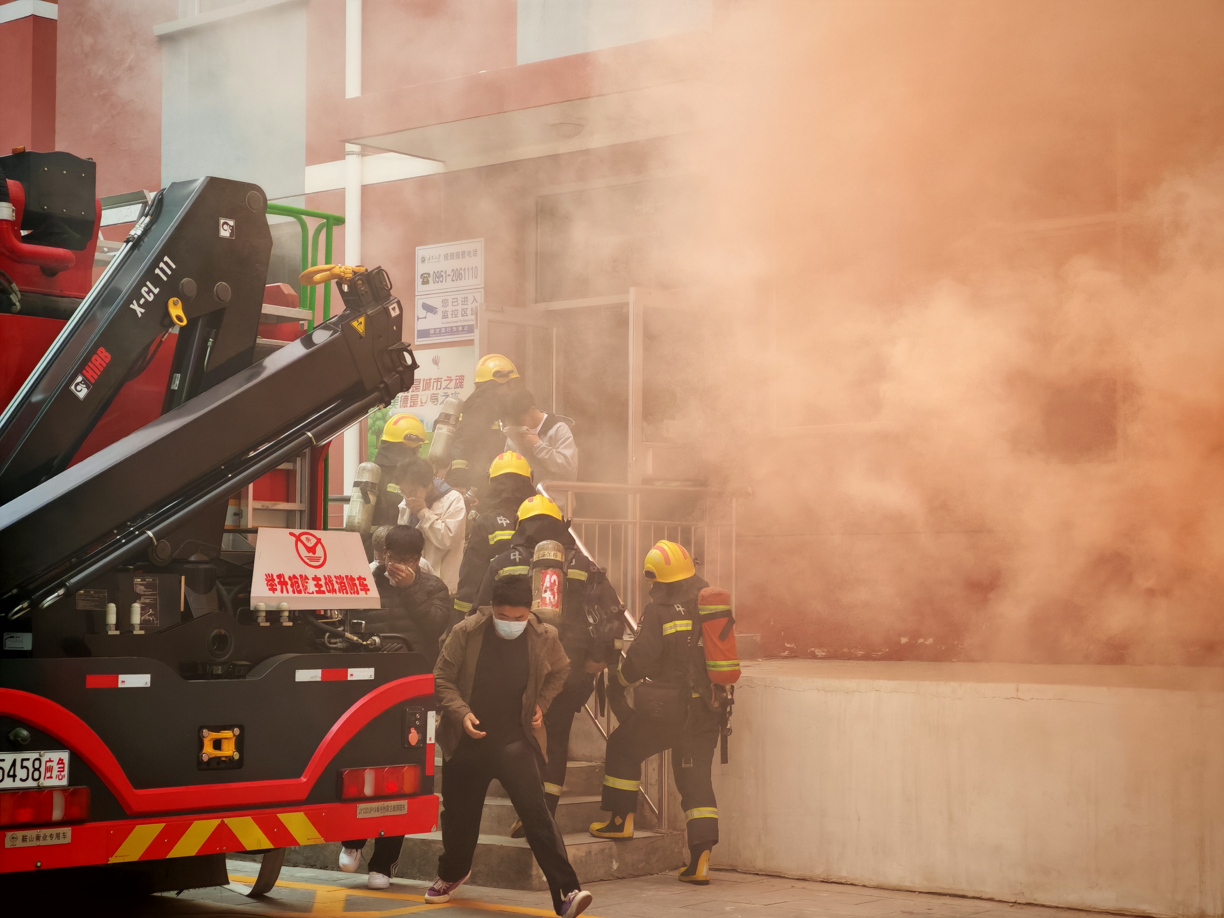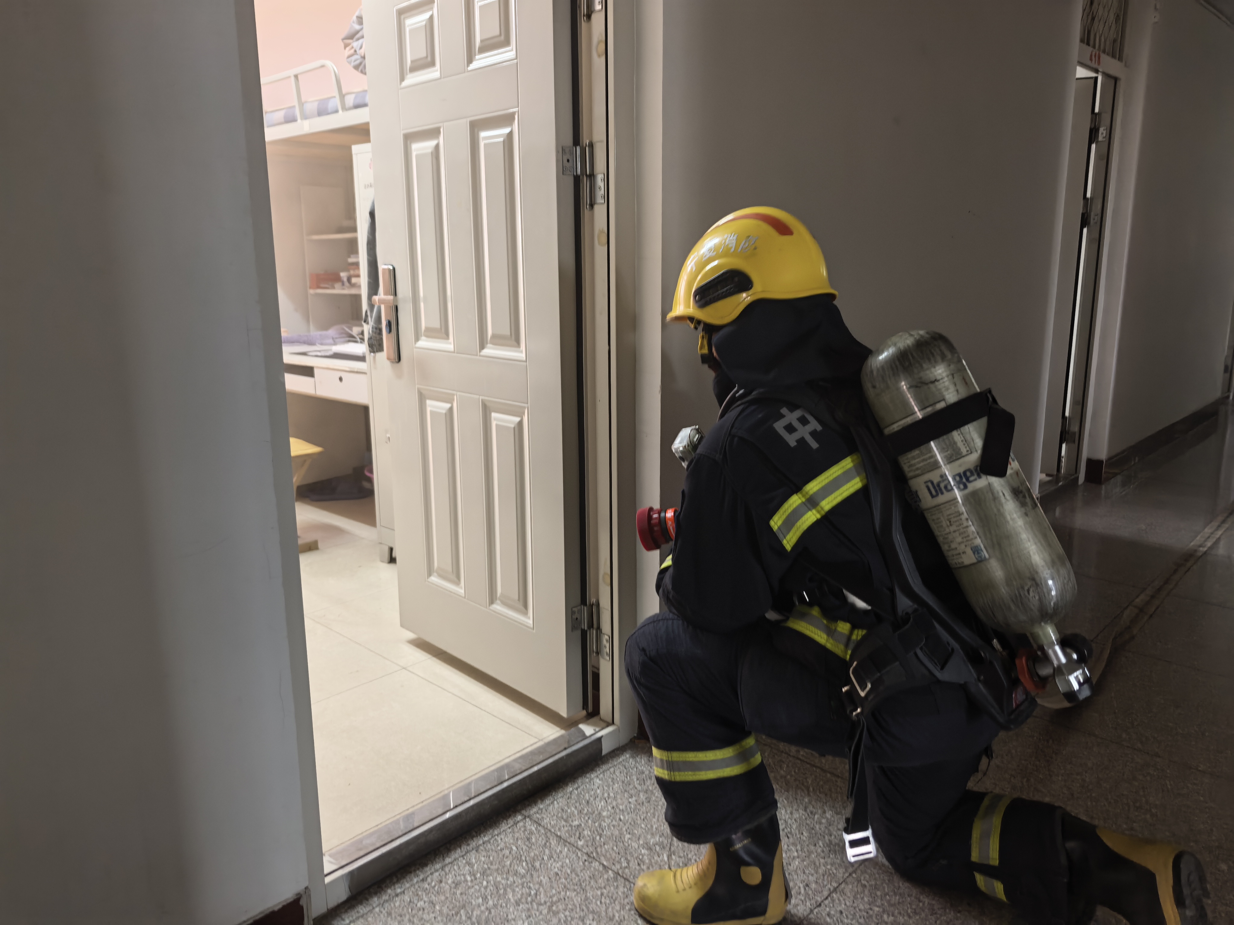 消防演练情景设置为学生宿舍8号楼420宿舍发现火情。宿舍同学立即拨打119报警电话,向外呼喊“着火了”,随着消防警报的拉响,各楼层同学在现场老师和安全员的指引下,弯腰躬身用湿毛巾捂住口鼻,沿着疏散路线快速、有序地撤离。消防队接到报警电话后迅速出警抵达现场,对‘着火宿舍’实施灭火,并成功救援出“被困同学”。整个过程紧张有序、实用性强,达到了预期效果。