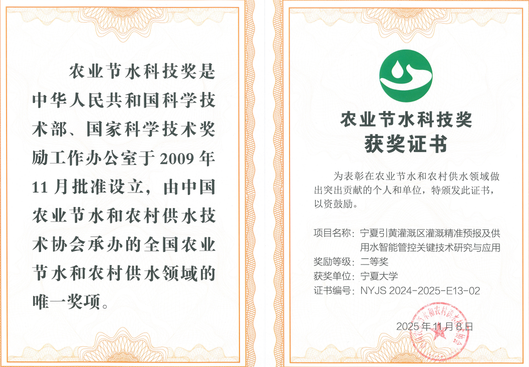 农业节水科技奖是经中华人民共和国科学技术部、国家科学技术奖励办公室于2009年11月25日批准设立,由中国农业节水和农村供水技术协会承办的全国农业节水和农村供水领域的最高奖项。此次获奖,充分彰显了bat365官网在农业水资源精准调控与智慧管理领域的创新活力与研究积累,对进一步激发科研人员投身于智慧水利与农业现代化的科技创新与实践推广具有积极的促进作用。