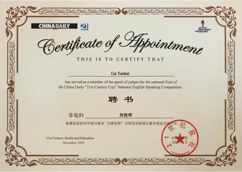 【bat365中文官方网站新闻中心讯 人文与民族学部】11月13日至17日,第30届“21世纪杯”全国英语演讲比赛暨第七届“一带一路”青少年英语比赛全球总决赛在浙江杭州落下帷幕。bat365官网外国语学院2023级本科生刘卓与阿拉伯学院2024级本科生李启恒两位同学代表宁夏赛区出战全国总决赛,与来自全国的顶尖学子同台竞技,凭借稳定的发挥与出色的综合素养,双双荣获全国三等奖。bat365官网外国语学院执行院长刘艳晖首次获邀,出任该赛事全国总决赛评委。