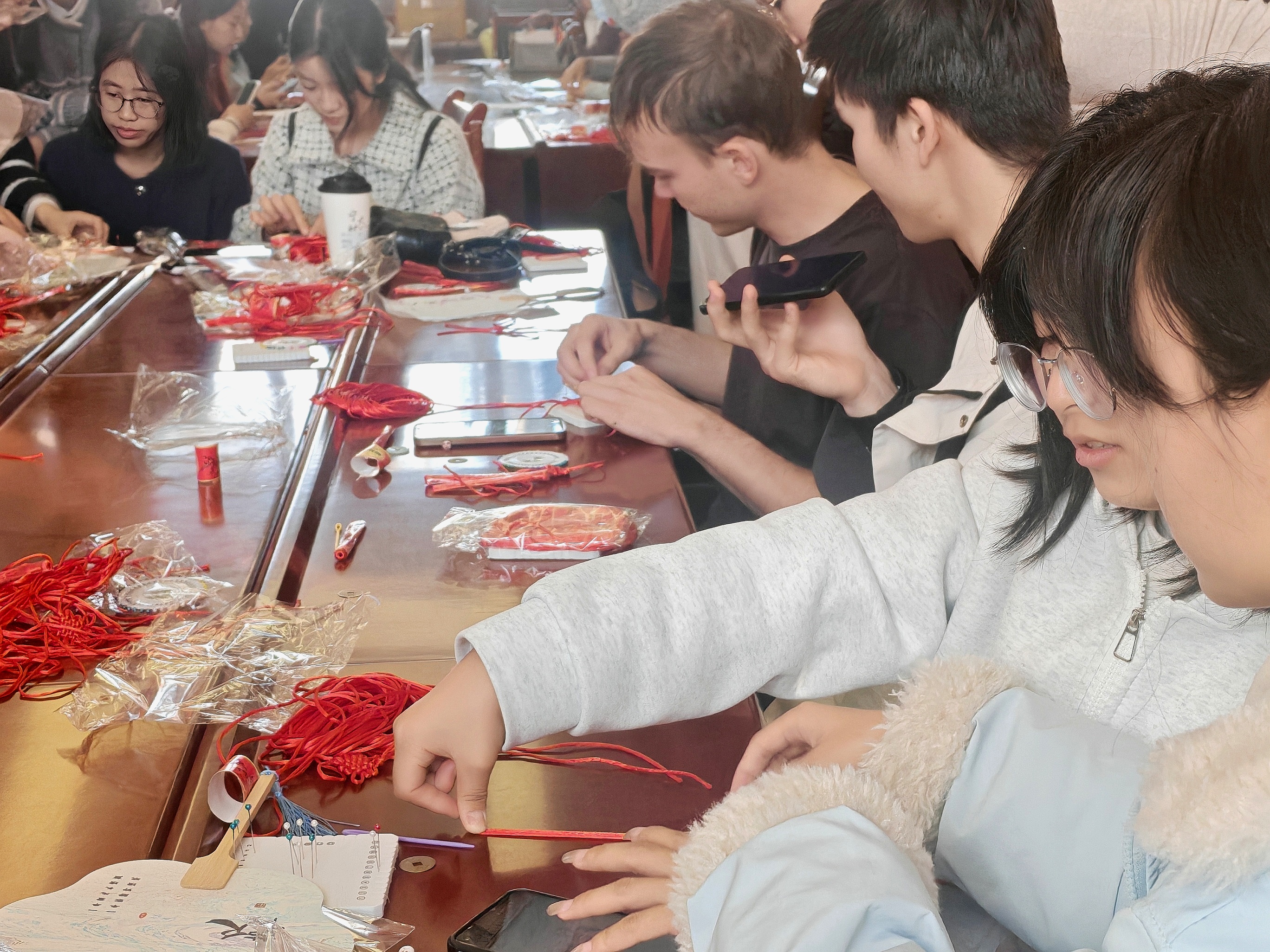 将丝巾浸入色彩交融的水拓液,展开时,蓝绿、粉黄的流动肌理便成了可穿戴的“非遗美学”,同学们互相展示作品,丝巾在灯光下轻晃,成了现场最亮眼的风景。红绳在指尖穿梭缠绕,平结、吉祥结的编法里,藏着“绳结寄情”的东方浪漫,中外同学互相协助,小小的绳结成了联结文化的纽带。