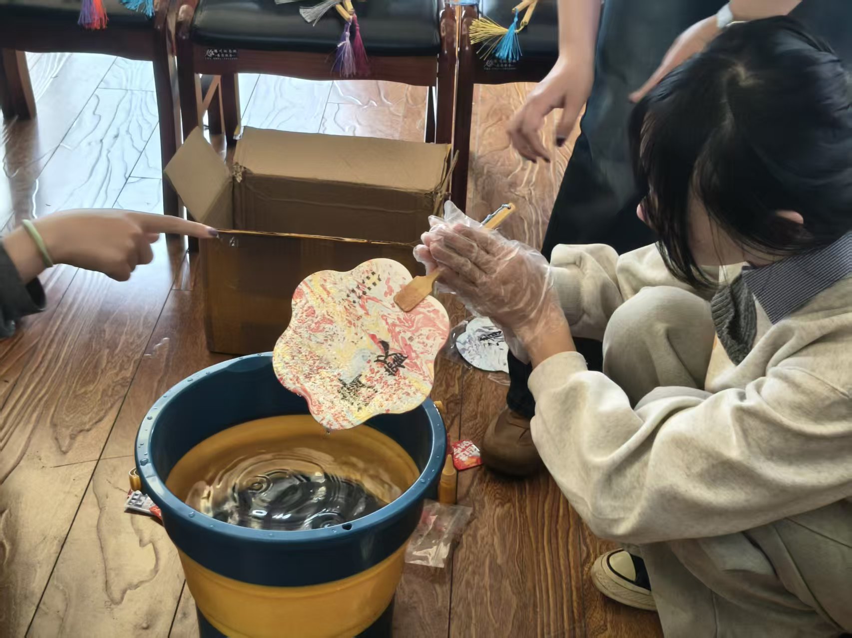 活动现场,同学们分为三组体验非遗技艺。瓷盘里的颜料随水波舒展,将扇面轻覆其上,再提起时,流动的纹理已定格成独一份的诗意。留学生举着刚完成的漆扇笑着说:“这是我收到的最有韵味的中国礼物。”