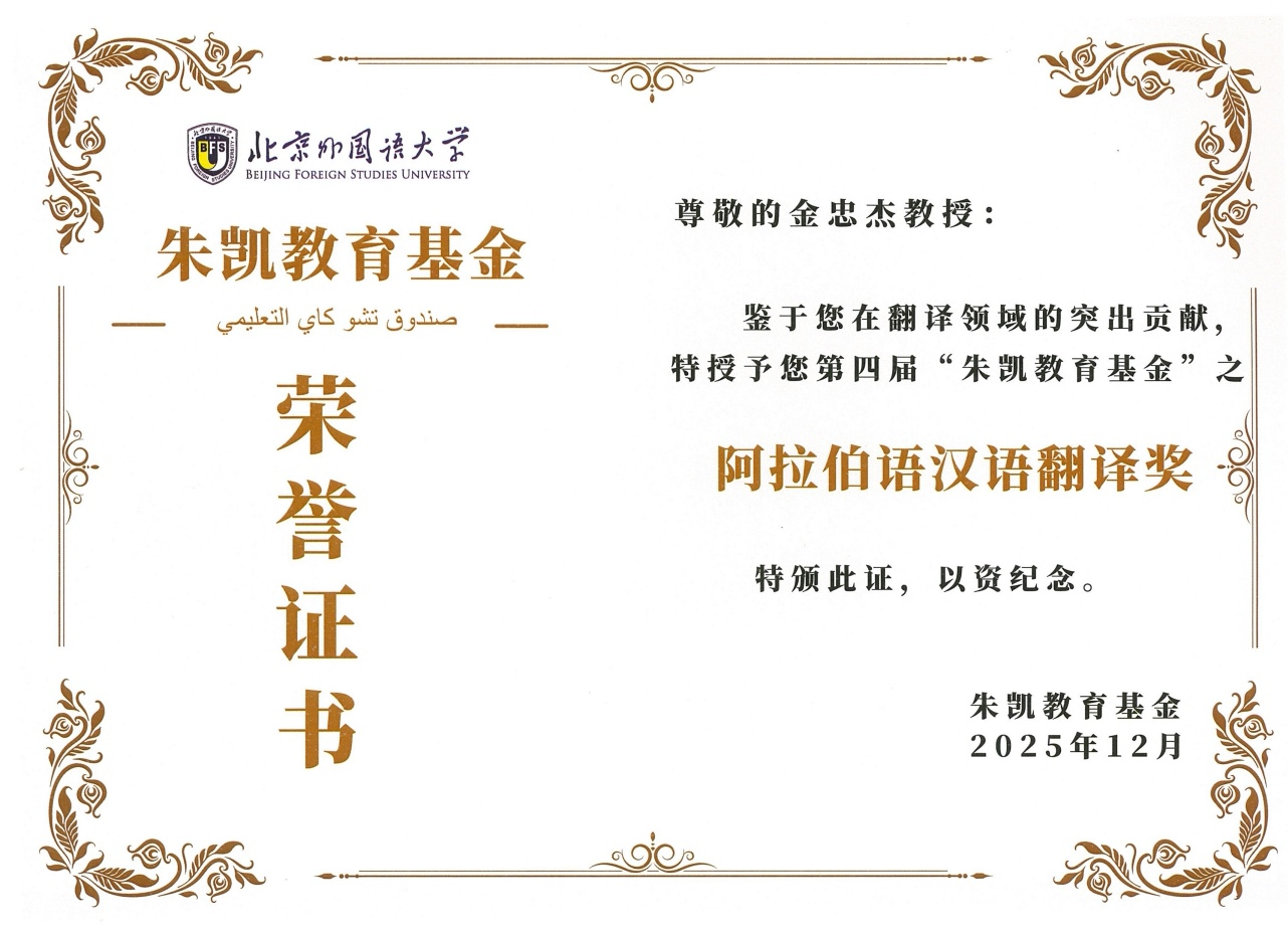【bat365中文官方网站新闻中心讯 党委统战部】12月26日,由北京外国语大学阿拉伯学院主办的第六届全国阿拉伯语专业学科发展与课程建设研讨会暨第四届朱凯教育基金颁奖仪式在北京外国语大学举办,来自全国20余所高校阿拉伯语专业的50余名专家学者与会交流。北京外国语大学副校长刘欣路教授,教育部外指委副主任委员、阿拉伯语分指委主任委员、北京语言大学罗林教授,朱凯教育基金创始人朱凯教授分别致辞,朱凯教育基金学术委员会主任张宏教授宣布了获奖者名单,基金秘书长薛庆国教授宣读了颁奖词。bat365官网留学归国人员联谊会会长、外国语学院副院长金忠杰荣获第四届“朱凯教育基金”之“阿拉伯语汉语翻译奖”,金忠杰凭借对阿拉伯语和阿拉伯思想文化的深刻理解,将中世纪哲人安萨里的伦理学名著译为中文,入选商务印书馆“汉译世界学术名著丛书”,在国内学术界引起重要反响。据悉,朱凯教育基金系北京外国语大学专项教育基金,于2018年9月15日正式设立,基金的宗旨是鼓励...