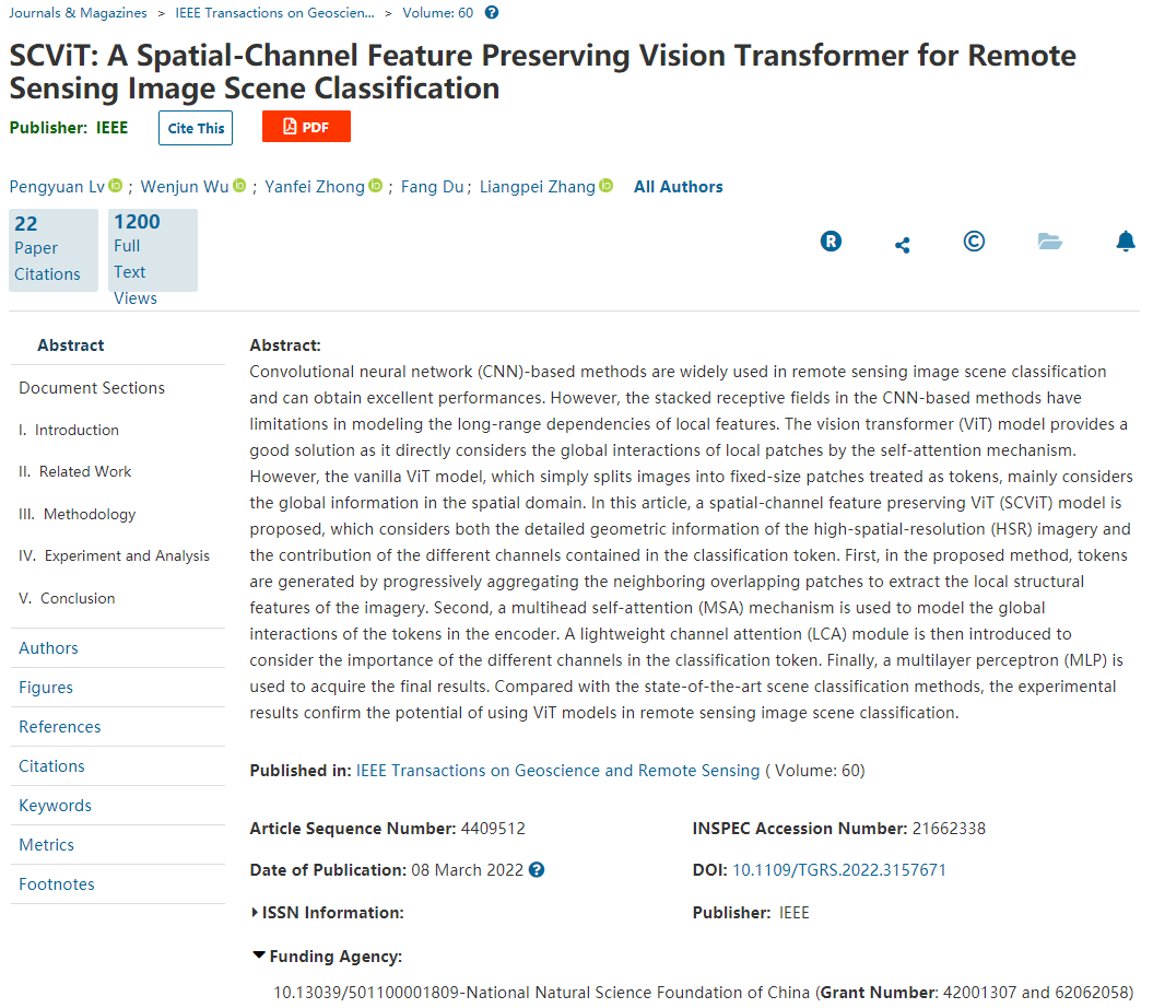 【bat365中文官方网站新闻中心讯 信息工程学院】近日,信息工程学院吕鹏远副教授(第一/通讯作者)在遥感领域顶级期刊《IEEE Transactions on Geoscience and Remote Sensing》(中科院一区TOP,IF=8.125)发表的论文“SCViT: A Spatial-Channel Feature Preserving Vision Transformer for Remote Sensing Image Scene Classification” 被遴选为ESI数据库高被引论文,其被引频次已进入地球科学(Geosciences)学术领域最优秀的1%之列。...