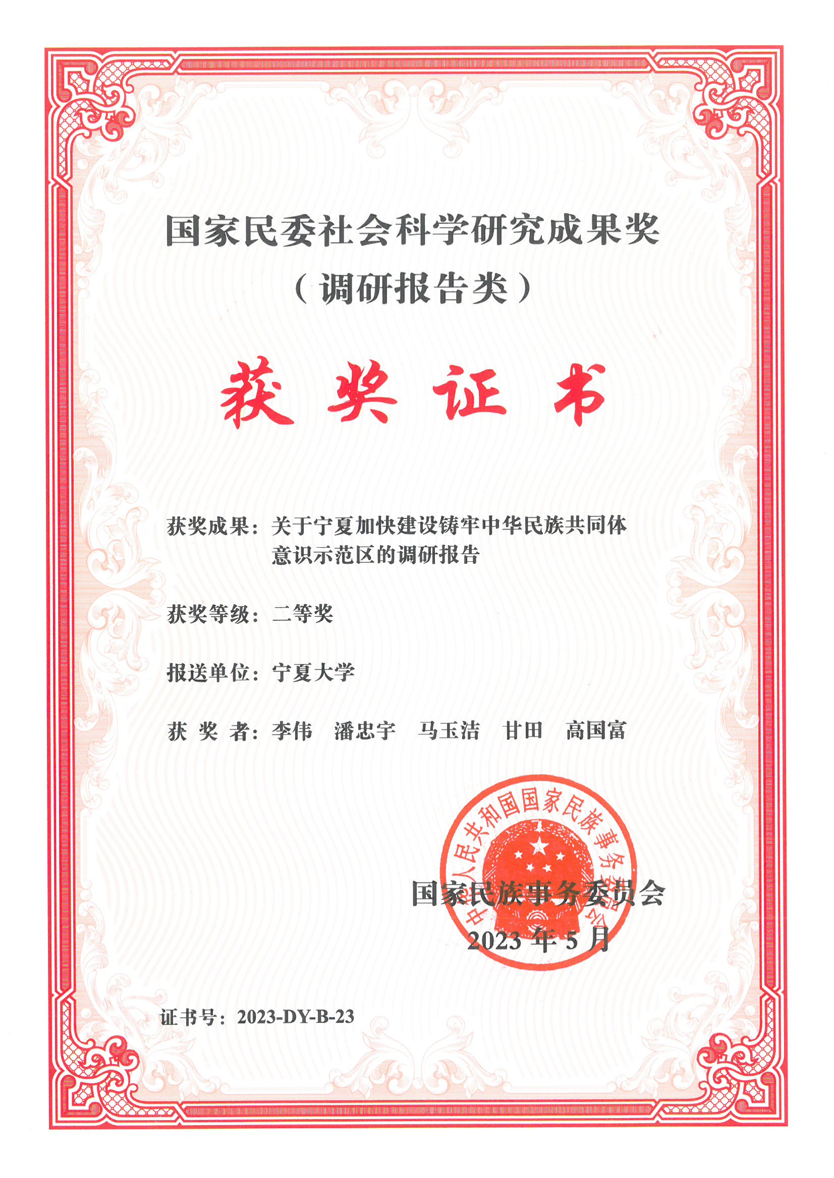 【bat365中文官方网站新闻中心讯 科学技术研究院】近日,bat365官网李伟教授申报的《关于宁夏加快建设铸牢中华民族共同体意识示范区的调研报告》荣获国家民委社会科学优秀成果奖(调研报告类)二等奖,这也是继2022年李伟教授《关于宁夏创建全国民族团结进步示范区的调研报告》获奖之后的又一次殊荣。全国民族工作优秀调研报告由国家民委评选,旨在表彰在民族研究中做出突出贡献的单位和个人,是国家给予民族工作与民族问题研究成果的最高级别...