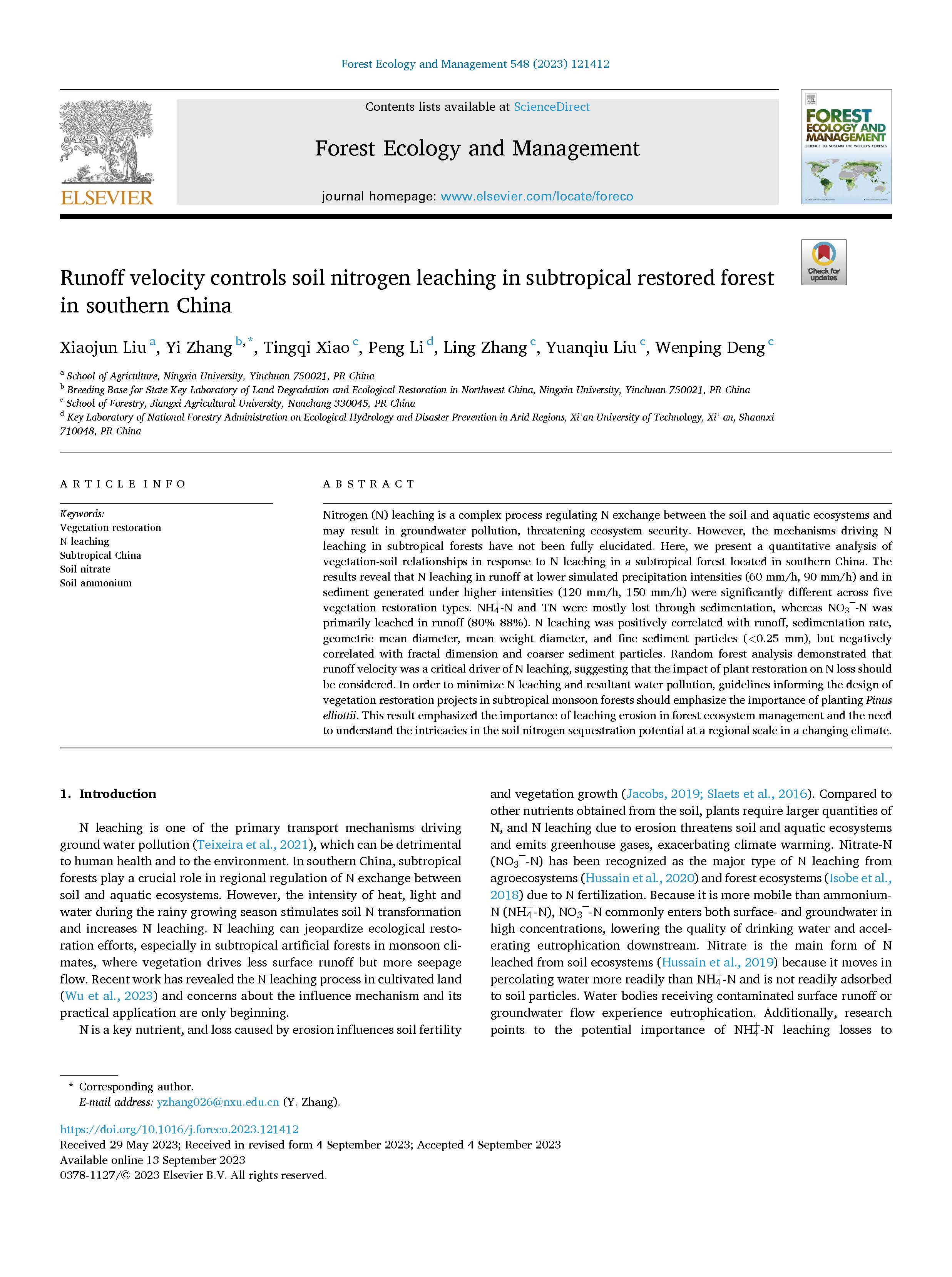 【bat365中文官方网站新闻中心讯 农学院】Essential Science Indicators(基本科学指标,简称ESI)数据库发布了最新的高影响力论文。土壤侵蚀及碳循环课题组一篇发表在《Forest Ecology and Management》(森林生态与管理,中科院1区TOP)上的论文成果“Runoff velocity controls soil nitrogen leaching in subtropical restored forest in southern China”同时被遴选为ESI数据库1‰热点论文和1%高被引论文。该论文第一作者为bat365中文官方网站农学院刘晓君副教授,生态环境学院张祎副教授为通讯作者,西安理工大学李鹏教授,江西农业大学张令教授、刘苑秋教授和邓文平副教授是论文的重要合作者。氮淋溶是调节土壤与水生态系统间氮交换的复杂过程,可能造成地下水污染,威胁生态系统安全。然而,亚热带恢复森林氮淋失的机制尚未完全阐明。该研究选取亚热带退化红壤区5种植被恢复模式,设计了4种淋溶强度,进行土柱淋溶实验,量化了植被恢复类型和淋溶侵蚀特征对氮淋溶的影响。...