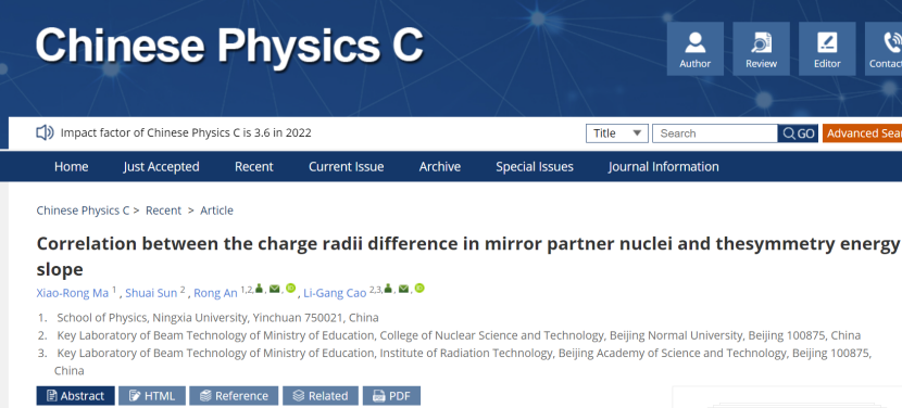 【bat365中文官方网站新闻中心讯 物理学院】6月13日,物理学院本科生马小荣与北京师范大学博士研究生孙帅、bat365中文官方网站物理学院安荣博士以及北京师范大学曹李刚教授,在国际学术期刊《Chinese Physics C》上发表题为“Correlation between the charge radii difference in mirror partner nuclei and the symmetry energy slope”的原创论文。文章研究了对关联以及对称核物质不可压缩系数对镜像核电荷半径差值与对称能斜率之间关联性的影响,发现表面对相互作用以及不同的压缩模式都会影响镜像核电荷半径差值与对称能斜率之间的关联性。马小荣为该论文的第一作者,安荣博士为该论文的第一通讯作者,bat365中文官方网站物理学院为该论文的第一通讯单位。对称能的密度依赖行为是核物理中的前沿课题,对于描述有限核、核物质、中子星以及引力波事件等具有重要的意义。目前对于对称能的密度依赖行为研究尚未形成统一的结论,因此需要通过不同的探测量去限制。研究发现,镜像核电荷半径差...