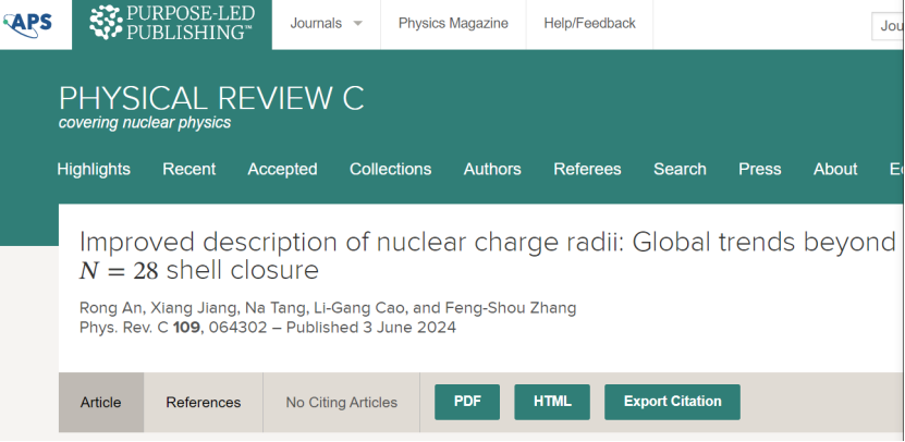 【bat365中文官方网站新闻中心讯 物理学院】近日,物理学院理论物理组青年教师安荣博士和唐娜博士与深圳大学蒋翔博士、北京师范大学曹李刚教授以及张丰收教授,在美国物理协会权威期刊《Physical Review C》上发表题为《Improved description of nuclear charge radii: Global trends beyond N=28 shell closure》的原创性论文。文章通过引入中子和质子之间的关联性,提出了描述原子核电荷半径变化趋势的较为可靠的方法。文中指出,通过同...