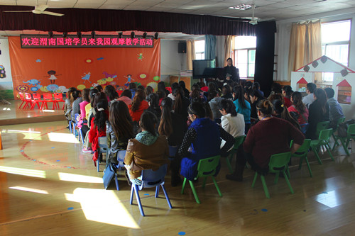 实践课教学是“国培”工作的重要一环。《教育部关于深化中小学教师培训模式改革,全面提升培训质量的指导意见》明确要求:“实践性课程应不少于教师培训课程的50%”。根据今年欧冠官网幼师国培第一期课程安排,为了解我市学前教育先进的保教管理经验,10月24日上午,幼师国培全体学员分两组分别前往渭南市临渭区示范幼儿园、小哈佛中英文幼稚园现场观摩幼儿园教学活动。