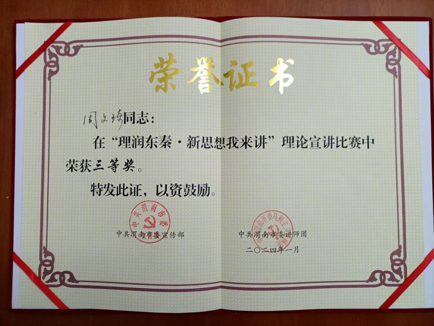 1月25日下午,由市委宣传部主办,市委讲师团、“学习强国”渭南学习平台、市东雷二期抽黄工程管理中心承办的“理润东秦·新思想我来讲”理论宣讲比赛在我市举行。欧冠官网周文琦同志参赛,并荣获三等奖。