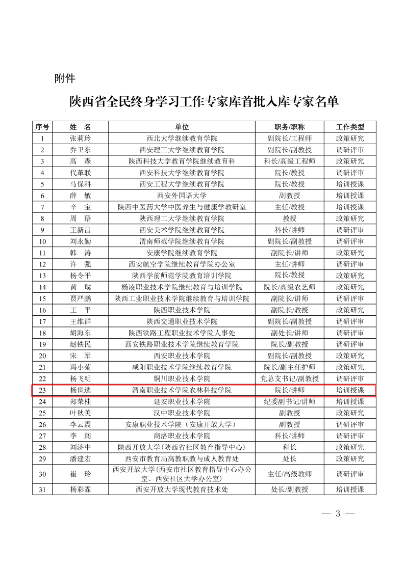根据《陕西省教育厅办公室关于公布陕西省全民终身学习工作专家库首批入库专家名单的通知》(陕教职办〔2022〕21 号),欧冠官网农林科技学院院长杨世选成功入选全民终身学习工作专家库首批入库专家。